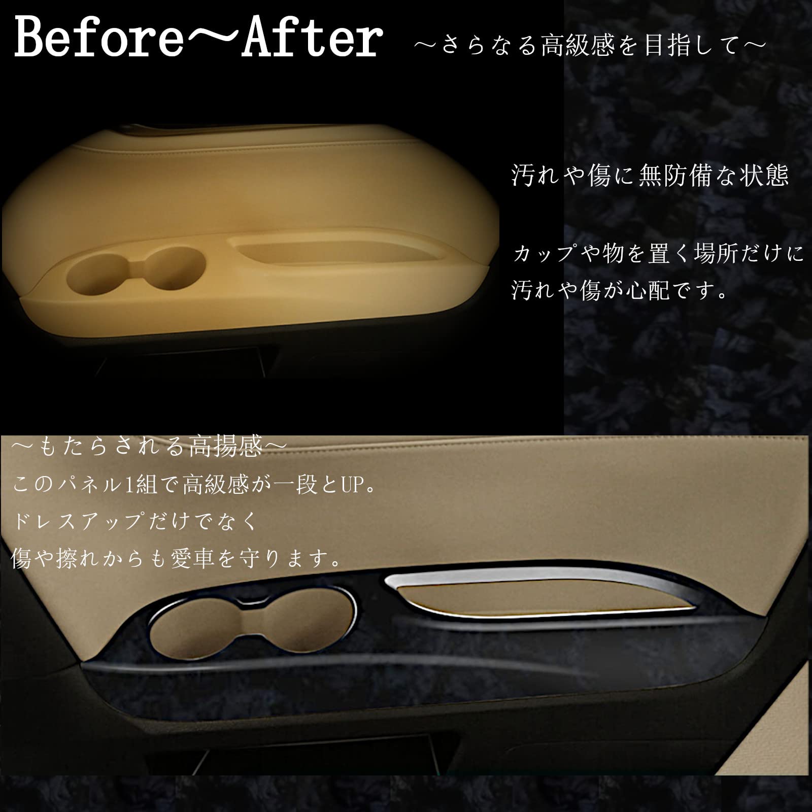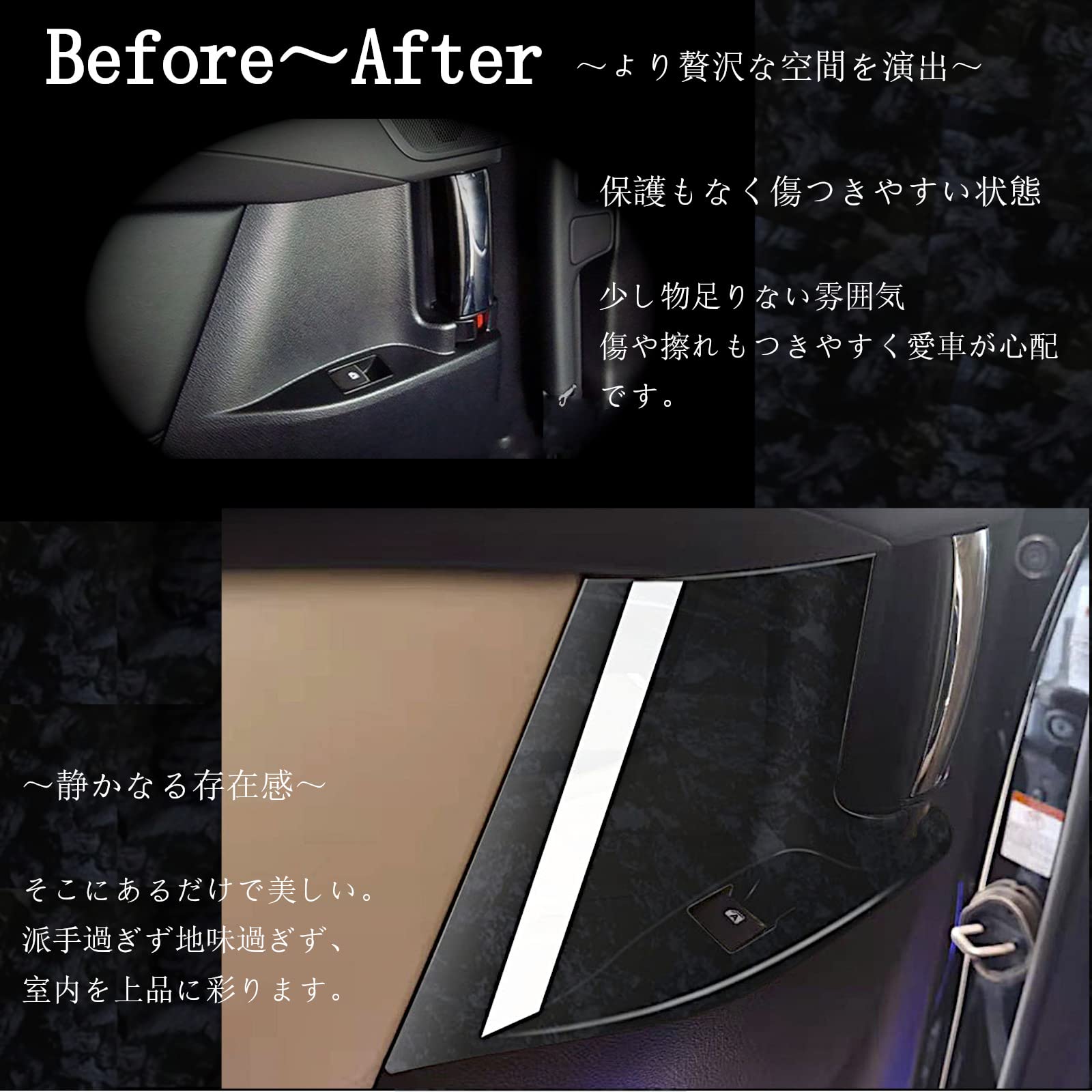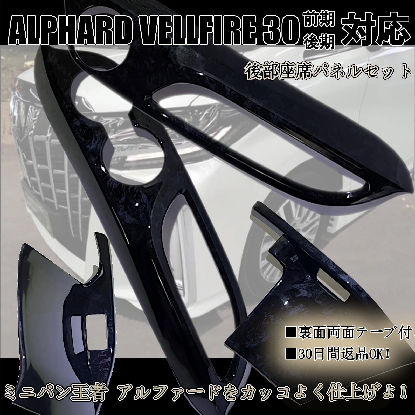 【特徴】アルファード ヴェルファイア 30系の前期・後期モデルに対応した黒木目調の 後席ドアスイッチパネルと 3列目 カップホルダーパネルのセットです。高級感漂うデザインで、車内の雰囲気を一新、後部のドレスアップが一度に可能です。 車種専用設計、両面テープは装着済み、専門知識や特別な工具は必要ありません。 車内全体の統一感、高級感をお求めの方、より豪華に彩りたい方におすすめです。