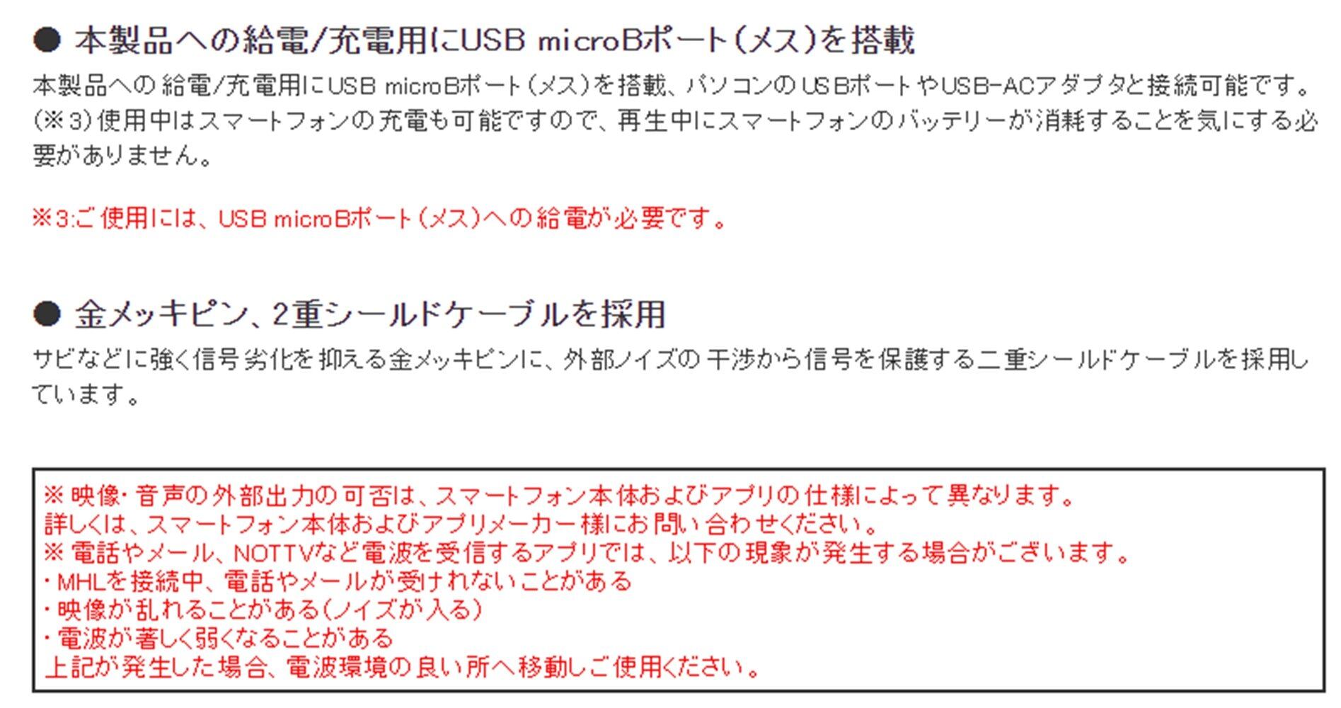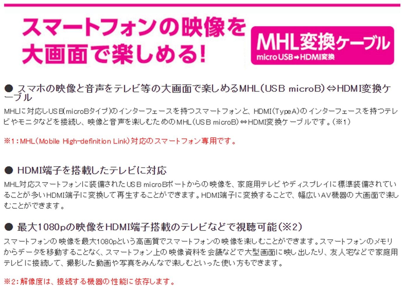 MHLに対応しUSB(microBタイプ)のインターフェースを持つスマートフォンと、HDMI(TypeA)のインターフェースを持つテレビやモニタなどを接続し、映像を楽しめるMHLケーブルです。パソコンやACアダプタから、本製品のmicroBポートへの給電が必要です。最大1080pの映像に対応しています。※解像度は接続する機器の性能に依存します。ケーブルを接続することでスマートフォンを充電可能なので、バッテリーの消耗を気にせずに映像を楽しめます。金メッキピンを採用しています。2重シールドケーブルを採用しています。