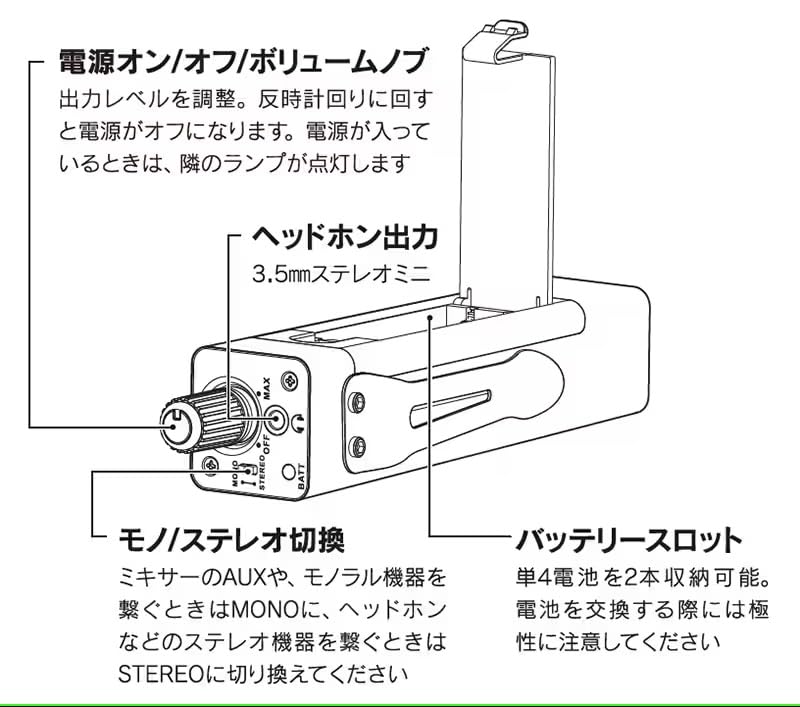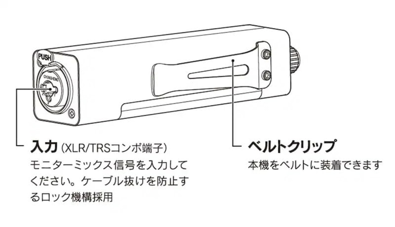 有線のインイヤー・モニターを使う演奏者に最適なベルトパック仕様の当製品は、重さ96g、サイズ3.7cm× 3.2cm ×14.1cmと非常に軽量で超小型のボディを採用。XLR/TRSコンボ入力、ステレオミニ出力、電源ON/OFF可能なレベルコントロールつまみ、ステレオ/モノラル切替スイッチを装備し、単4形乾電池2本で最長12時間駆動を実現しています。