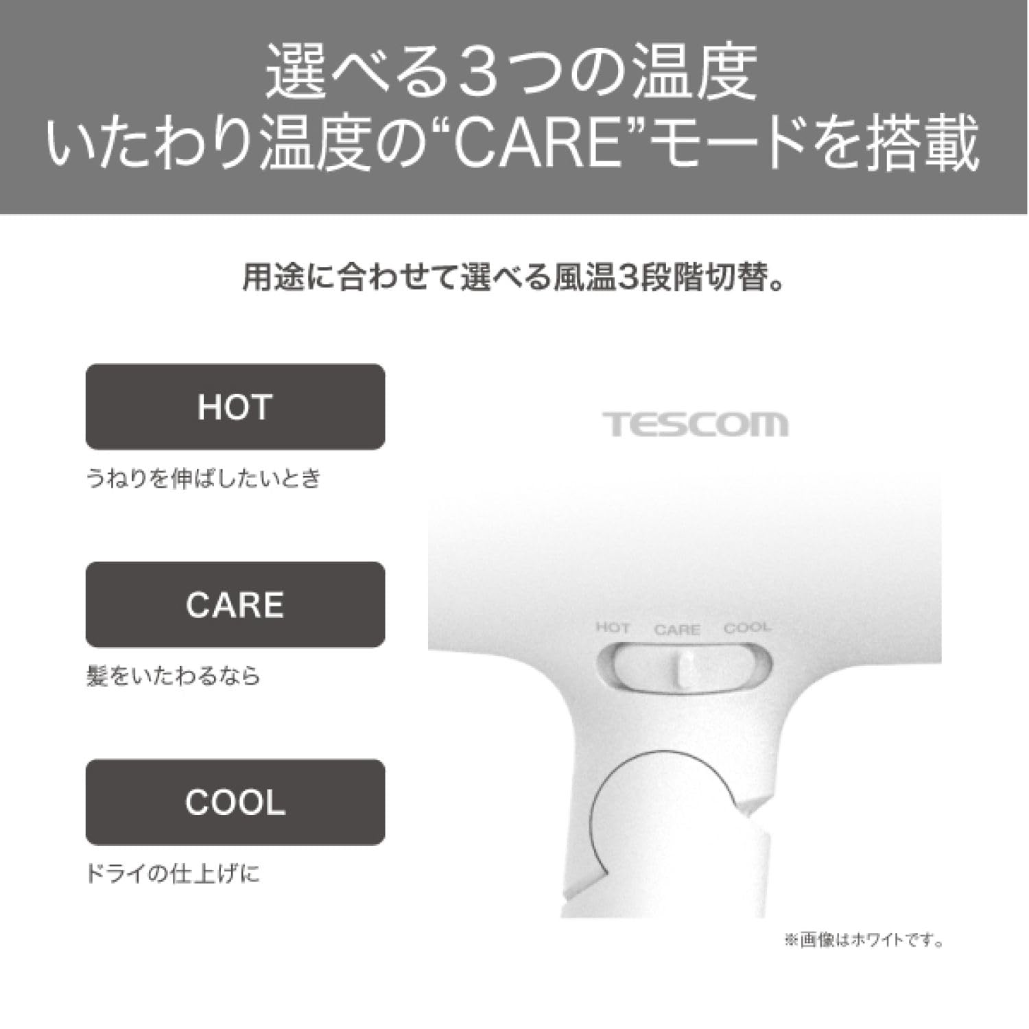 操作しやすい3段階の切替スイッチ構造。すばやく乾かしたいときは「HOT」モード、髪ダメージが気になるときは「CARE」モード、ドライの仕上げに「COOL」モードと、髪の状態やお好みの風温に合わせてモードの切り替えが可能です。