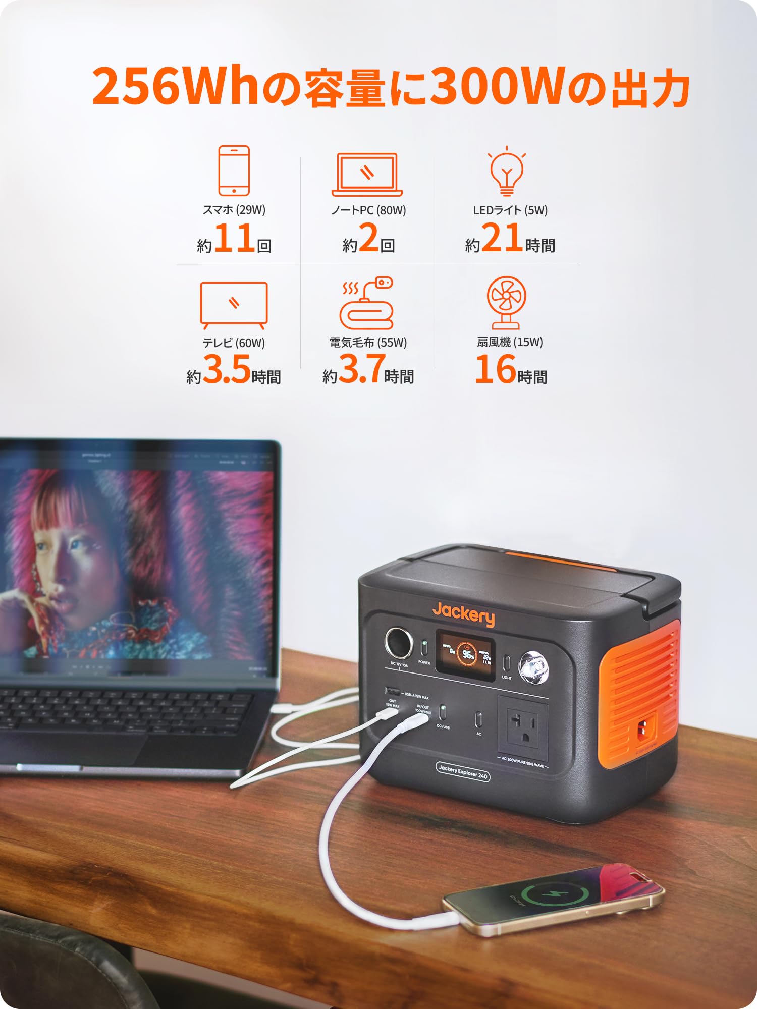 Jackery (ジャクリ) ポータブル電源 240 New 256Wh リン酸鉄 長寿命 定格出力300W 瞬間最大600W 60分急速充電 スマホ タブレット充電用 モバイルバッテリー コンパクト UPS機能 アプリ遠隔操作 純正弦波 AC100V 50Hz/60Hz 車中泊 停電対策 防災対策 ジャクリ [型番:JE-240A]