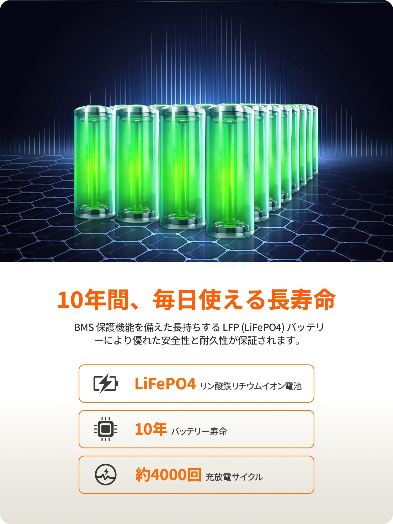 【10年使える長寿命】毎日充電しても10年間長持ちする高耐久リン酸鉄リチウムイオン電池、4,000回の充電サイクル後もバッテリー残量は70%を維持します。