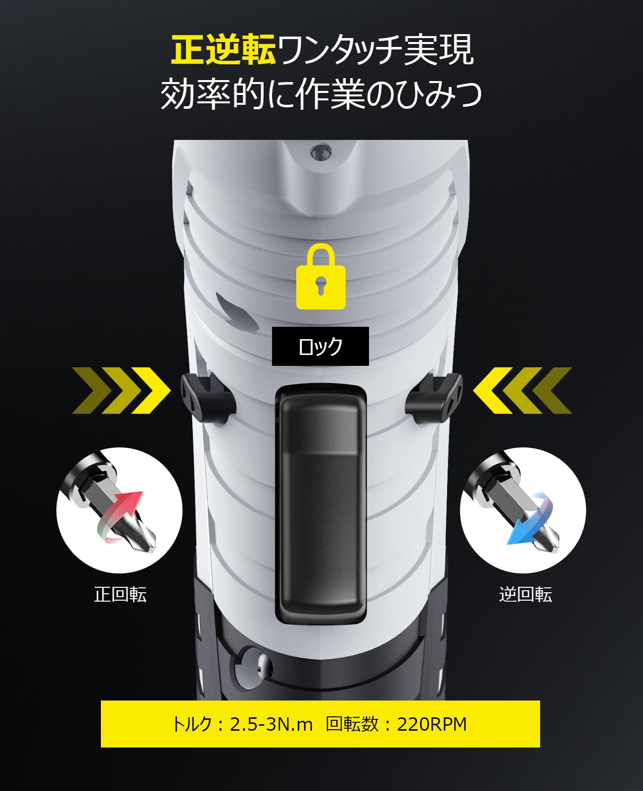 【正逆回転切替可能・最新強力4.2Vアップデート】最新版電動ドライバーはねじを締めたり緩めたりする回転方向は片手で切り替えられます。切り替えボタンを真ん中にあると、ロックモードになって誤作動の心配もありません。改良された最新電気ドライバーは優れた強力パワーを持って、組み立てが素早く効率的に完成!ボックスや机などの家具を組み立てるときに、力を使うことなく作業をスピーディーに進められます。