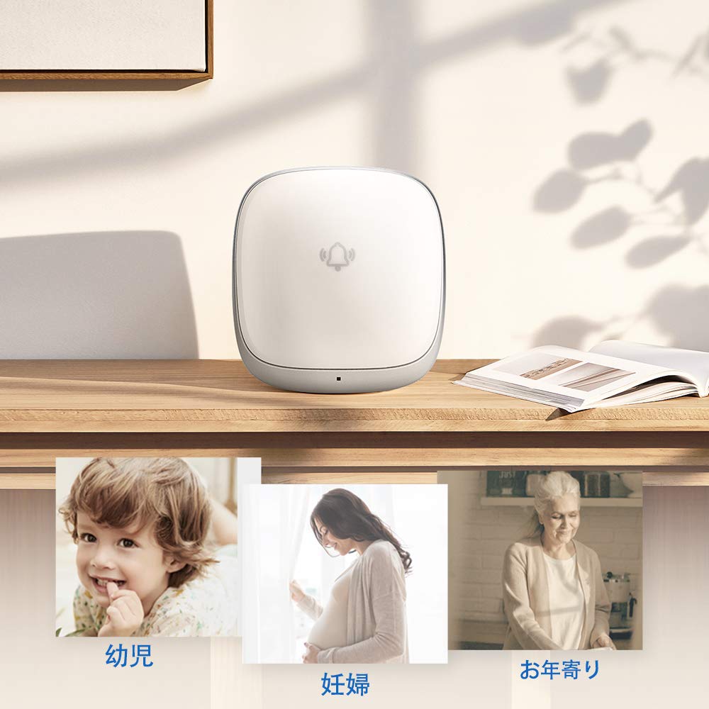 【ラクラクな取付】無線チャイムで配線工事が不要です。電池交換の不便もなくて、ドアチャイム受信機はコンセントに差し込むだけで、送信機をドアフレームに固定し(両面テープでの接着可能)ボタンを押すだけでチャイムが流れます。設置が簡単で手軽です。お子供や年寄りの方もご利用できます。うちのワイヤレスチャイムはご自宅、お風呂、介護現場、飲食店はもちろん、事務所や倉庫などで活躍します。