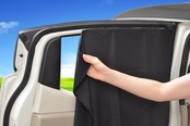 ○カーテン上部にマグネットが内蔵されており、車窓の上部の金属フレームにつけるだけで誰でも簡単に着脱が出来ます。