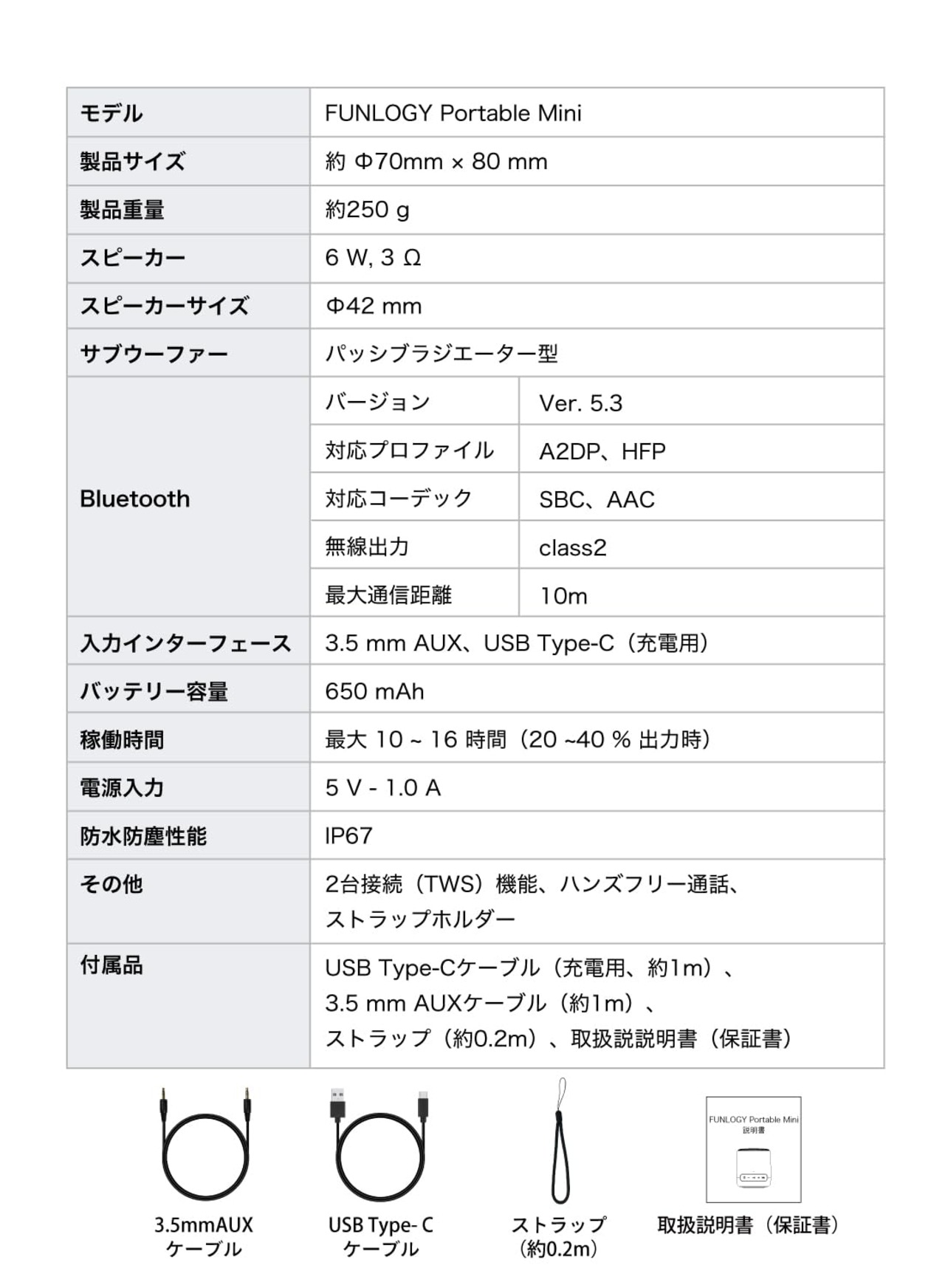 【商品仕様】(本体)サイズ:W 70 mm × D 70 mm × H 80 mm / 重量:250 g / スピーカーユニット:42 mm / 出力:6 W / インピーダンス:3 Ω / SN比:100 dB / Bluetooth:ver. 5.3 / 最大通信距離: 10 m(障害物が無い時) / 入力インターフェース:USB Type-C、AUX / 電源:DC 5 V 1.0 A / バッテリー容量:650 mAh / 稼働時間:10 時間(40 % 出力時) / 防水性能:IP67 / その他:TWS、ハンズフリー通話 / 付属品:USB Type-Cケーブル(1m)、3.5mm AUXケーブル(1m)、ストラップホルダー(約0.2m) 取扱説明書