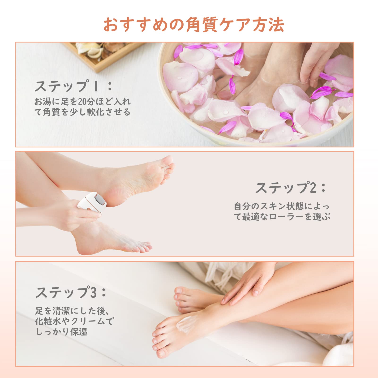 「3種類ローラー」 電動式の角質リムーバーは細目ローラー、レギュラーローラー、粗目ローラーという3種類のローラーが付属され、自分の足裏の状態に適応なローラーを取付、頑固な角質も、日常的なお手入れもこの1台で実現できます