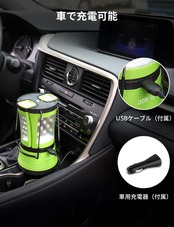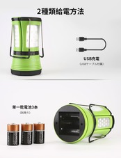 【充電と電池と両方使用できる】usb充電でも、電池でも、充電と電池が併用できるので、使い勝手は良いです。満充電+単1乾電池*3本(別売り)併用で、2面点灯/約66時間、4面点灯/約33時間使用可能です。(充電池のみの場合は、2面点灯/約6時間、4面点灯/約3時間)。また、車用充電器が付きますので、車中泊用の室内灯としても大変便利です。