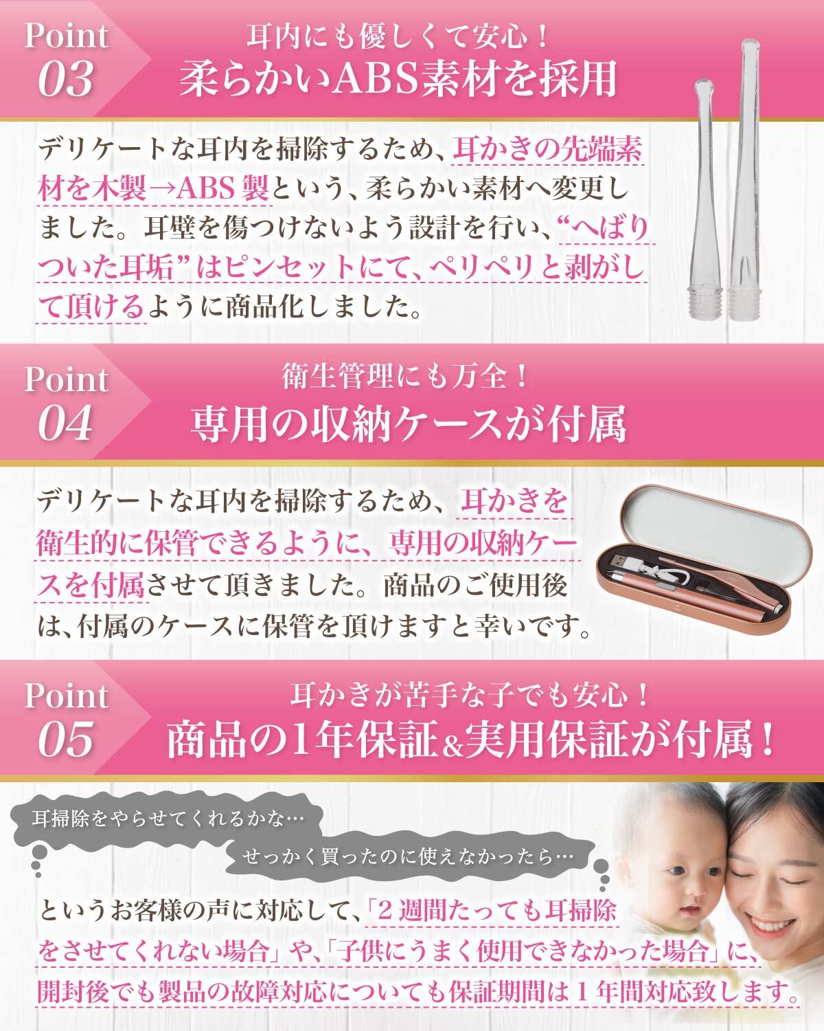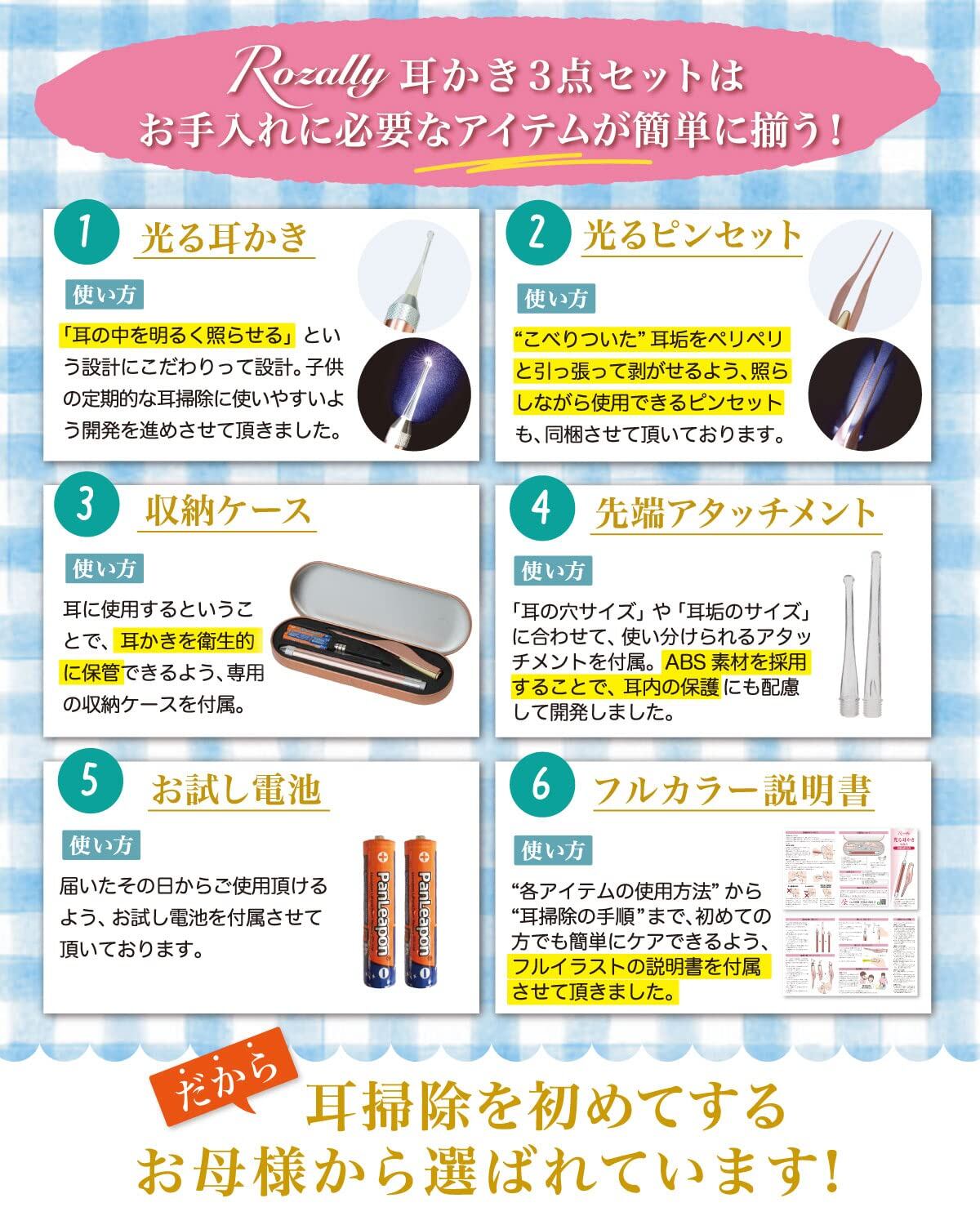 【こだわり】様々なメーカーから 子ども用 の みみかき 用品として” 耳掃除セット ”や” 光る耳かき + ピンセット ”が販売されていますが、Rozallyの 耳かき セット 電池ver は”こだわり”が一味違います。 照明付き耳かき や 照明付きピンセット など 育児&子育てアイテムをメインに取り扱っている10社以上の工場からサンプルを取り寄せ、「使いやすさ×安全性」を一緒に試行錯誤して頂けた1社に絞って発注を行なっています。 製造カラーについても かわいい 単色3カラーにて展開をさせて頂きました。「出産祝い」や「産後祝い」のプレゼントなどにもご愛用頂いております。