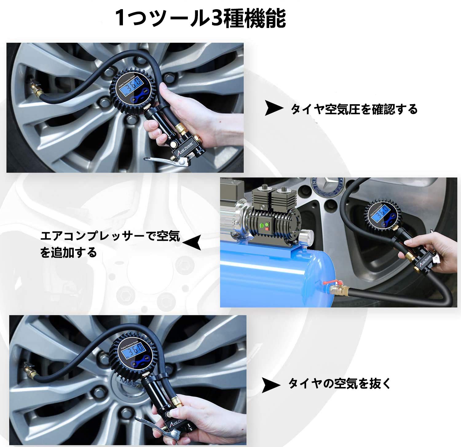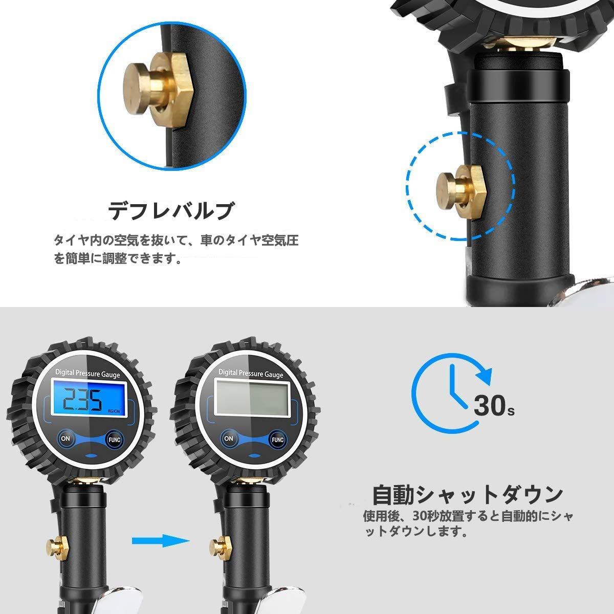 【使いやすい】空気圧計は使いやすく、複数の機能を備えており、実際にタイヤ圧力を正確に監視できます。また、エアコンプレッサーと接続すると、車両のタイヤを膨らませることもできます。