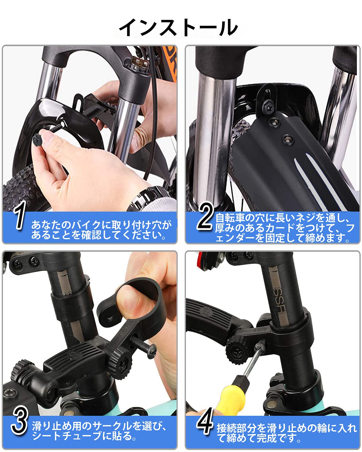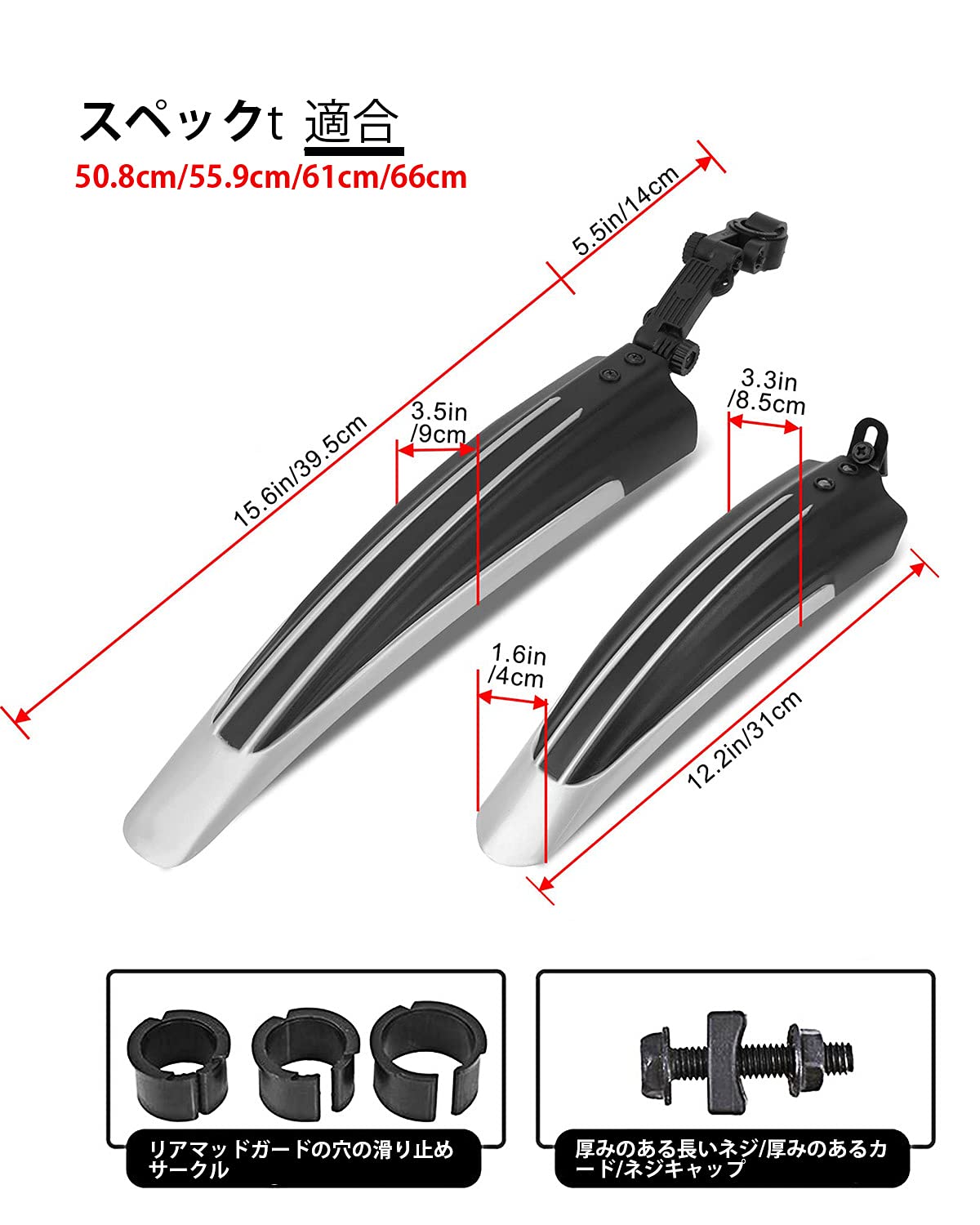 【サイズフィット】 当社の自転車用フェンダーは、20 ~ 26 インチの前輪と後輪に適しています。当社の自転車用フェンダーは、あらゆるタイプのマウンテン バイク、ロード バイク、ツーリング バイク、レーシング バイクなどに適しています。雨の日も快適なライディングとなりますよう、心よりお祈り申し上げます。
