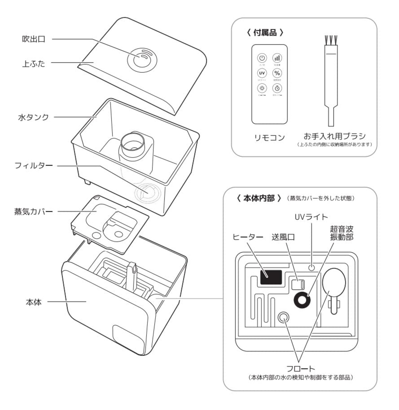●本体サイズ:(約)W260×D200×H270mm 約2.3kg●電源:AC100V 50/60Hz●消費電力:超音波30W 超音波+加熱170W●加湿方式:ハイブリッド方式●加湿量:超音波約400ml/h 超音波+加熱約550ml/h●適用床面積(目安):約30~60㎡ ●運転音:約50dB●タンク容量:約4Ⅼ●コード長さ:約1.6m●付属品:リモコン、お手入れ用ブラシ、取扱説明書(書)