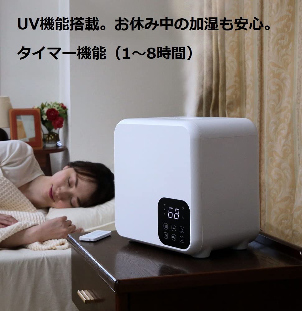 ●多彩な機能を搭載しています。【加湿量】3段階(弱/中/強)の切替ができます。【湿度設定】40~70%(5%単位)の設定ができます。【タイマー】1~8時間(1時間単位)が可能です。【UVモード】UVライト照射します。【加熱モード】内部の水を加熱して、衛生的&加湿量をアップします。