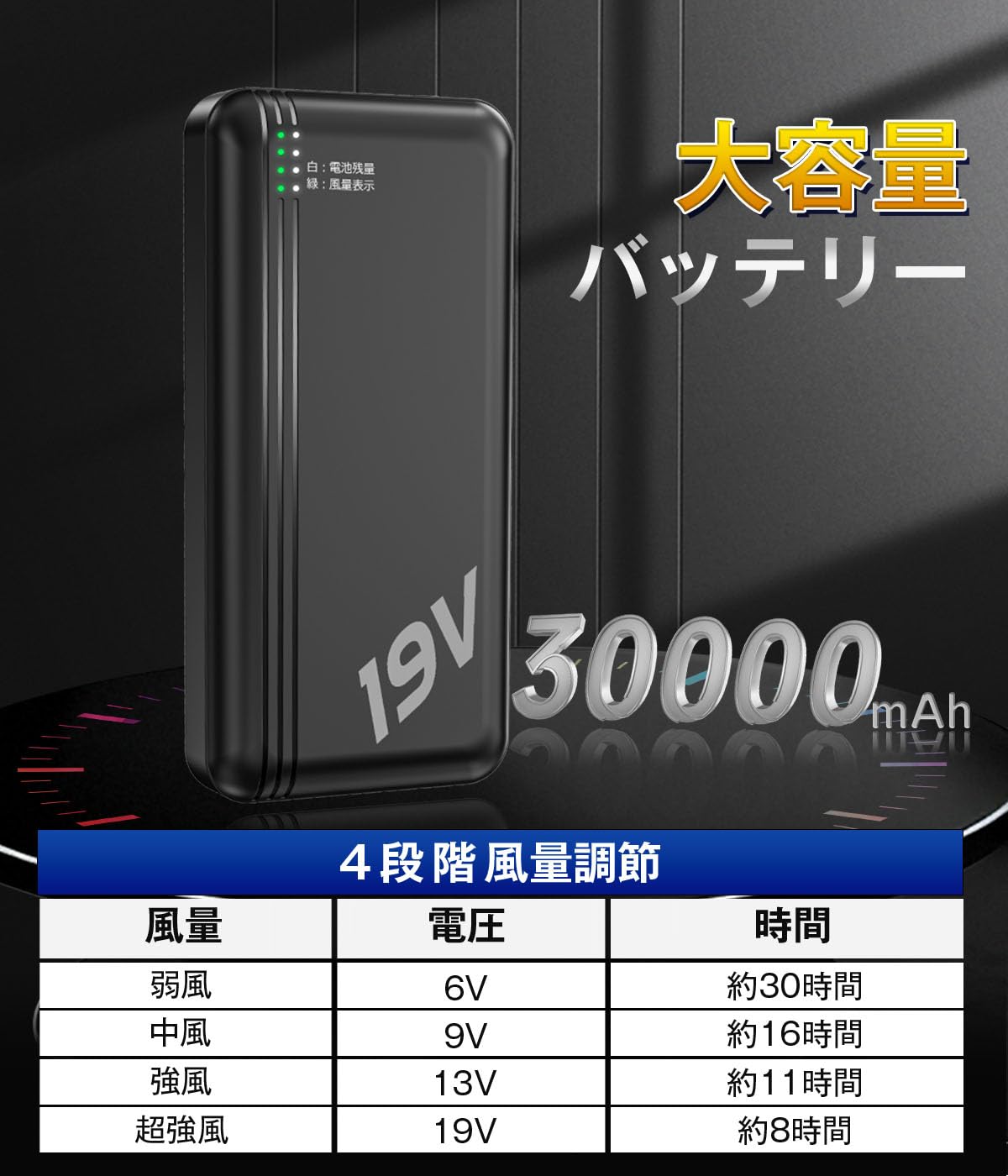 【30000mAh19V超大容量バッテリー】ファン付き作業服は30000mAhの大容量バッテリーが付属し、最大30時間連続稼働可能です。また、最大出力電圧19Vで、風量は圧倒的に上回り、瞬間的にクールダウンします。さらに、PSE認証を取得していますので、人体に害を及ぼすことなく、長時間でも安心してお使いいただけます。