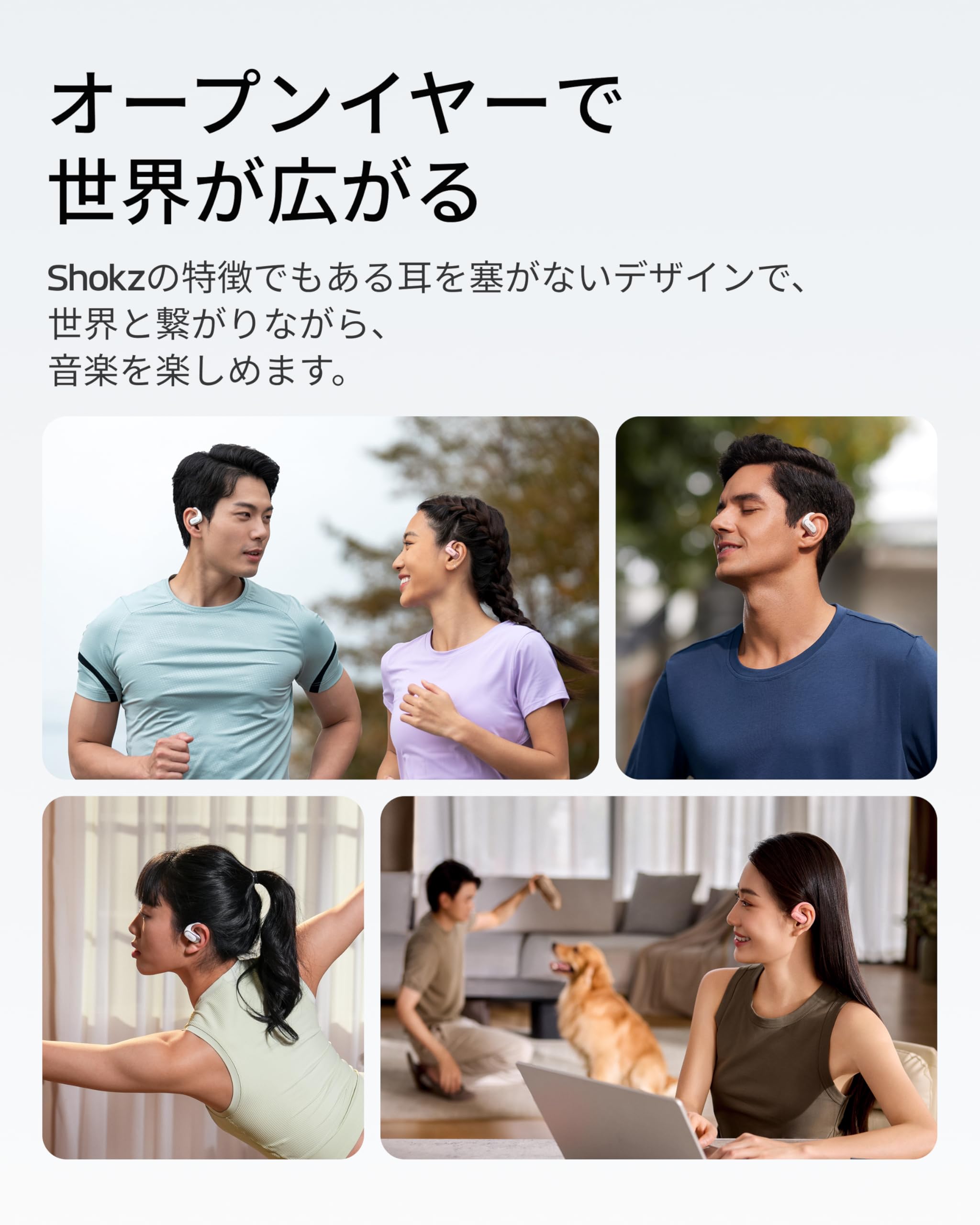 ナチュラルに整えられたサウンドを:当社独自のDirectPitch技術、Shokz OpenBass Air技術、18x11mmの大型ドライバーにより、オープンイヤー型でも高音質を実現し、ながら聴きに最適。単にバランスが取れているというだけでなく、音漏れを抑えてオーディオを正確にキープ。さらに、Shokzアプリの4つのプリセットEQモードでサウンドを自分好みに調整可能。