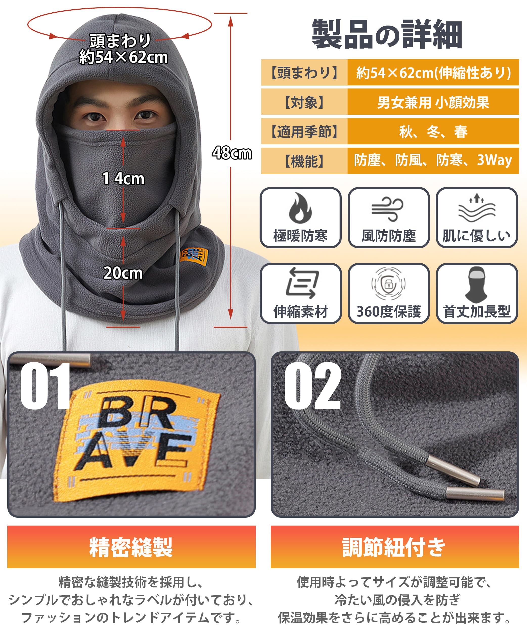 【3Wayスタイル付きのネックウォーマー】ネックウォーマー1つで3つのニーズに応えます! ネックウォーマーだけでも、フリースマスクにも、目出し帽にもなる多機能ネックウォーマー!3Way スタイル で防寒が出来るフード付き 多機能 ネックウォーマー(首長タイプ)/ フリースマスク(フードウォーマー); 首元の紐でサイズ調整ができ、ネックガード (ネック スカーフ)、フェイスガード (フェース マスク)、バラクラバ(目出し帽)、イヤーマフ (イヤーウォーマー/耳マフラー)、ビーニー帽子 等の多機能を果たします。 風の強い日や気温の変化など、さまざまな天候で着用でき、防寒対策も万全だ。1度付けたらもう外したくない!