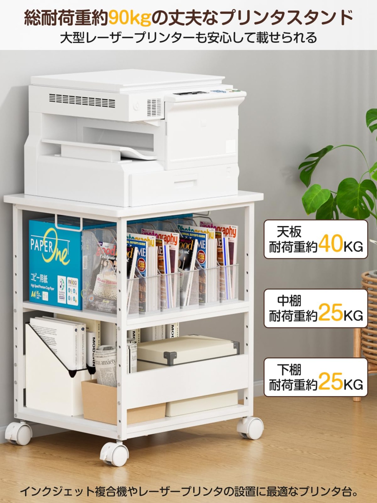 【総耐荷重90kg・大型プリンタ対応の頑丈設計】: プリンター台、オーディオラックとして使える3段サイドテーブルです。本体重量約12Kgあり、プリンタラックのサイズは幅60*奥行50*高さ70㎝です。A3、A4プリンタ対応可能、大型のレーザープリンタ対応もOKです。1.5㎝厚さの天板と2×2㎝のスチールフレームの組み合わせて、総耐荷重さ90Kgなので、上段にレーザープリンタ、中段にはコピー用紙や交換用トナーやインクなどの消耗品、下段にインクジェットプリンターやA4ファイルやラミネーターを置いて自由に収納できます。