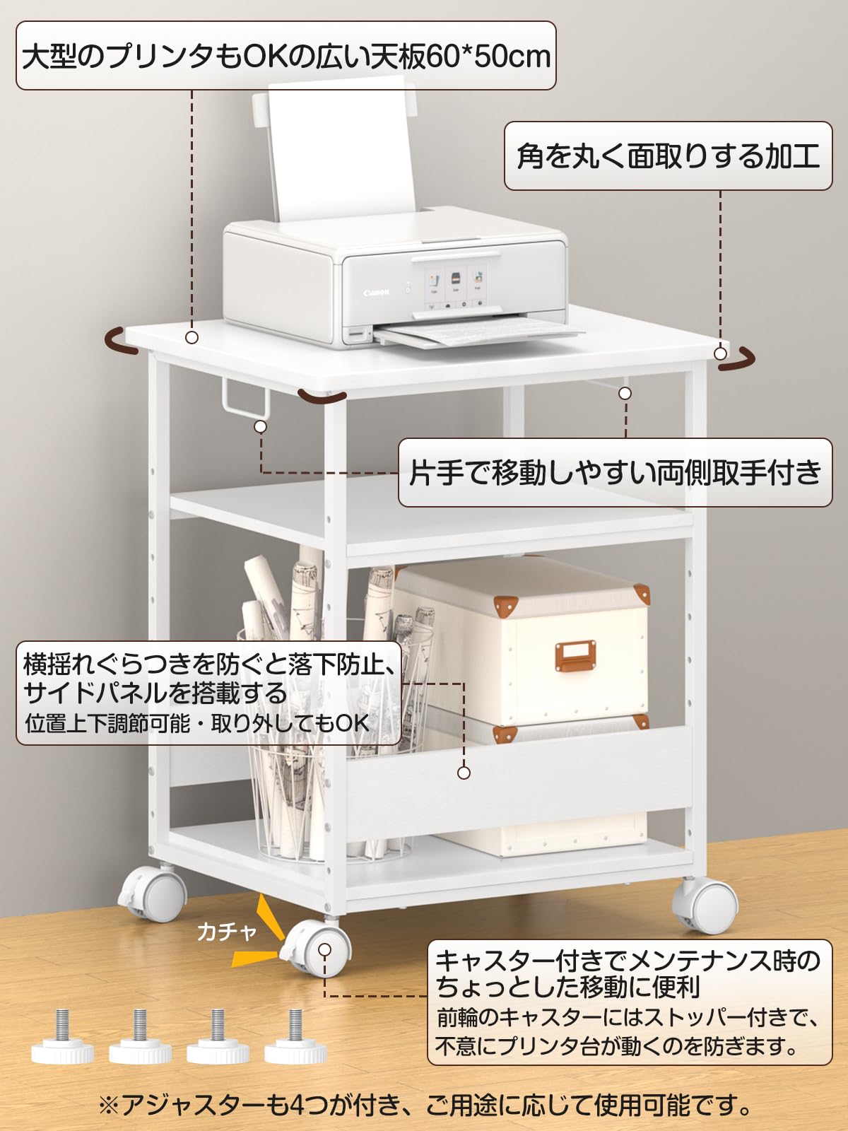 【数量限定】MIYOKI プリンター台 プリンタラック キャスター付き 幅60 奥行50cm 高さ70cm 総耐荷重90kg A3 A4対応 コピー機台 サイド デスク ワゴン デスク下 収納棚 事務用品収納 物置台 中棚9段階調節可能 組立簡単 (ホワイト) | ニコニコSHOP