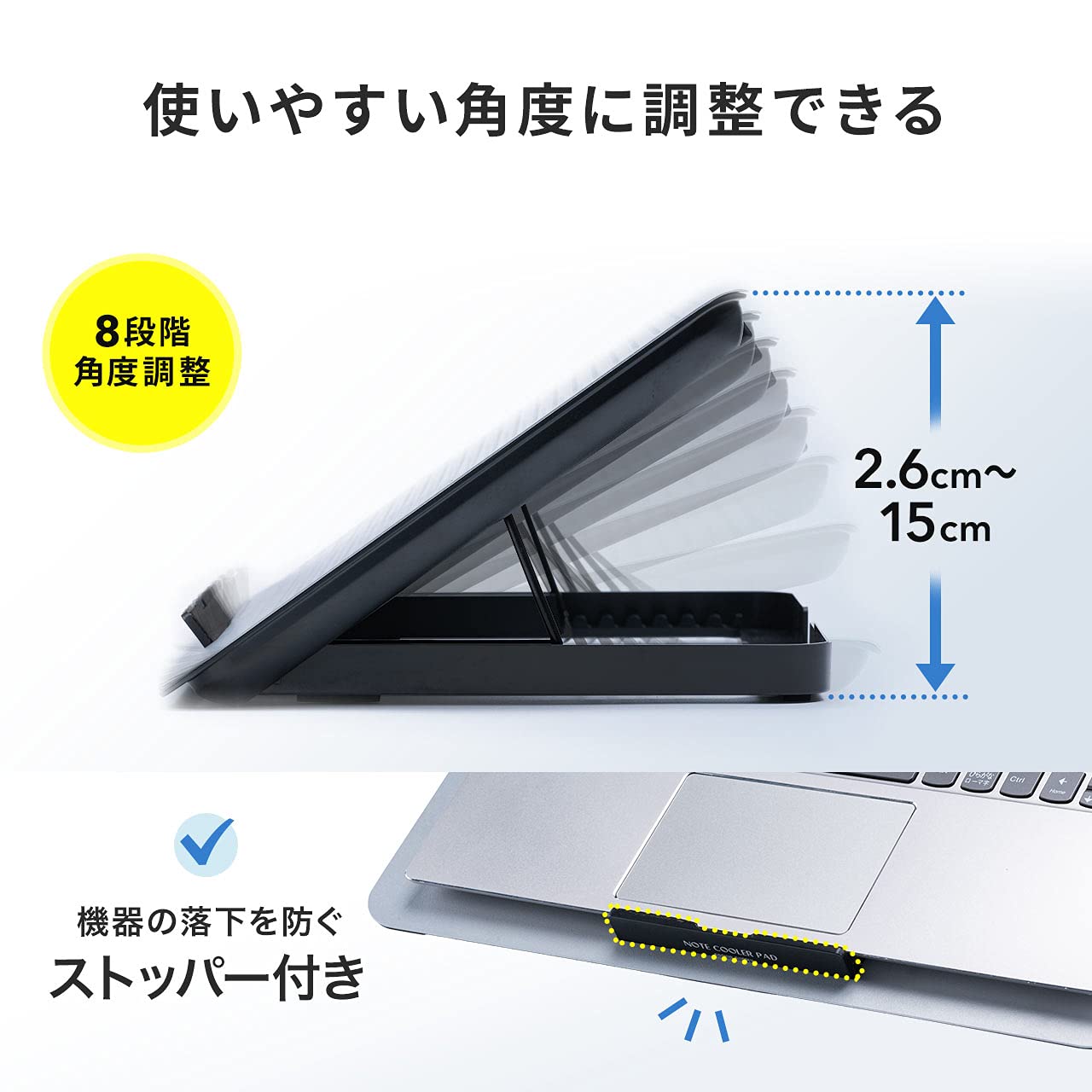 サンワダイレクト ノートパソコンクーラー 冷却台 アルミ 15.6インチ対応 静音 角度8段階 風量無段階 USB2ポート USB給電 400-CLN031