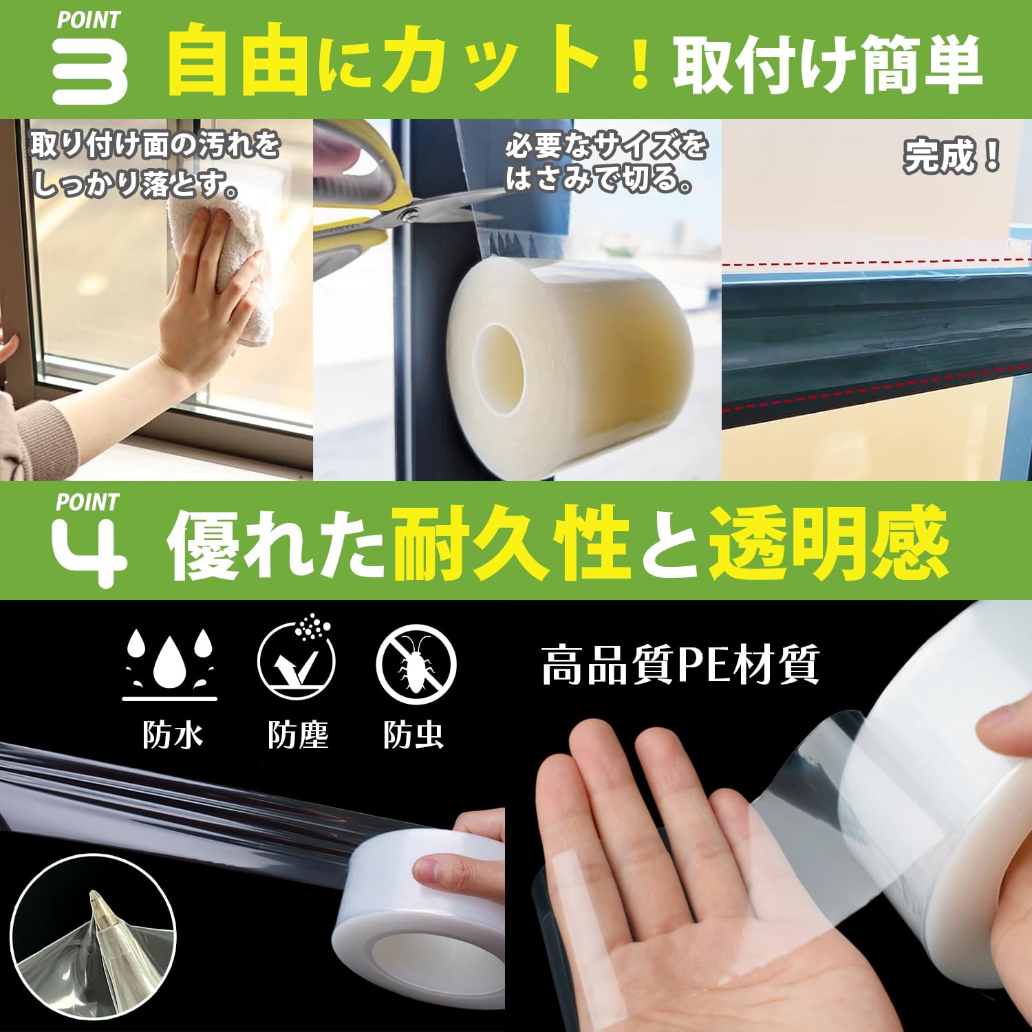 『強力な粘着力&ノリ残し無し』高品質な隙間テープ 窓は、伝統的な材料よりも強い引き裂き性、耐久性、耐水性、耐熱性、そして粘着力を誇ります。力を入れて引っ張っても割れたり裂けたりせず、長時間の水や太陽光、熱にさらされても劣化しにくく、高温や低温にも耐えます。さらに、超強い粘着力でしっかりと貼り付けられ、剥がす際にもノリが残りません。冬季には窓やドアの表面に貼り付けられ、春に取り外す際にも窓の塗装を傷つけず、透明な隙間テープは、冷気や高温、騒音を防ぎ、長期間のシール効果を提供します。