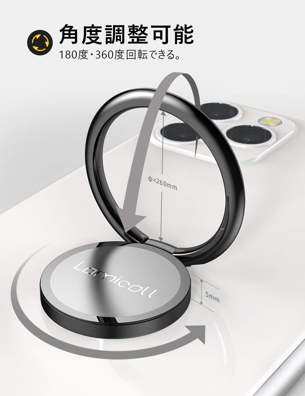 スマホリング 4㎜ 薄い 180度 360度回転式 : Lomicall 携帯電話 リングホルダー 片手持ち 携帯リング 指輪型 薄 フィンガーリング 薄型 アイホン 指リング スタンド機能 角度調整 丸型 取り外し 落下防止 車載磁石ホルダー対応 iPhone 17 17pro Air 16e 16Plus Pro Max 15 14 13 12 ミニ XS XR se アンドロイドに対応 黒