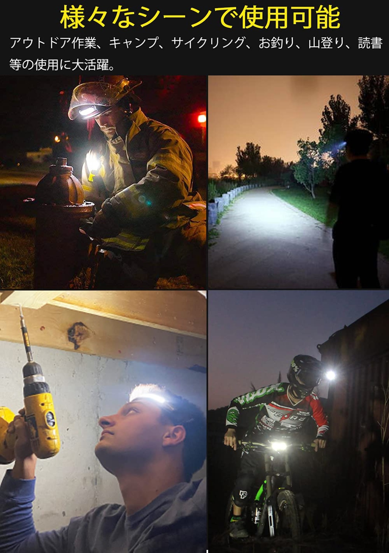 【高輝度&センシング人体センサー搭載】高品質LED搭載で光学凸レンズを採用し、均一な発光が届ける最大輝度350ルーメンの充電式ヘッドライトです。 照射距離最大約200メートルまで届けます。センシング機能が搭載している為、照明モードのまま、センサースイッチを押せばセンシングモードに入り、手をかざすだけで点灯/消灯が可能です。夜釣り、車の修理などの場合は非常に便利です。汚れた手で触る必要はありません。