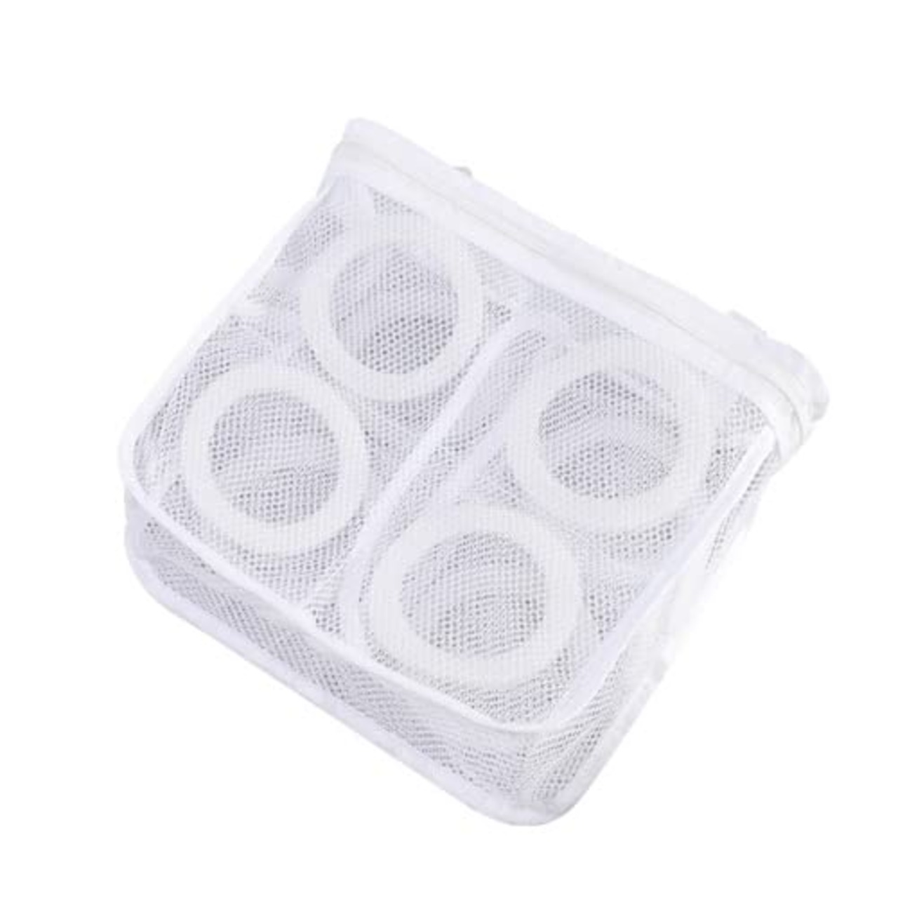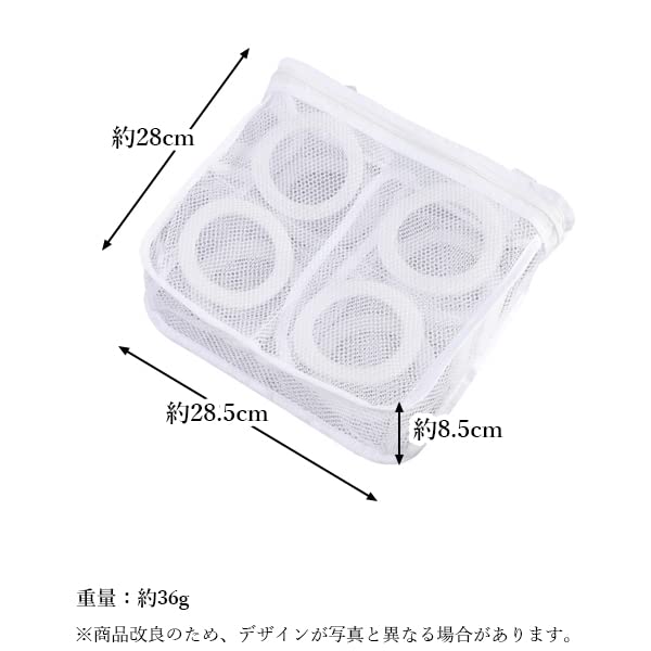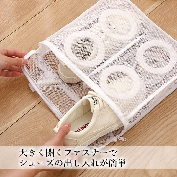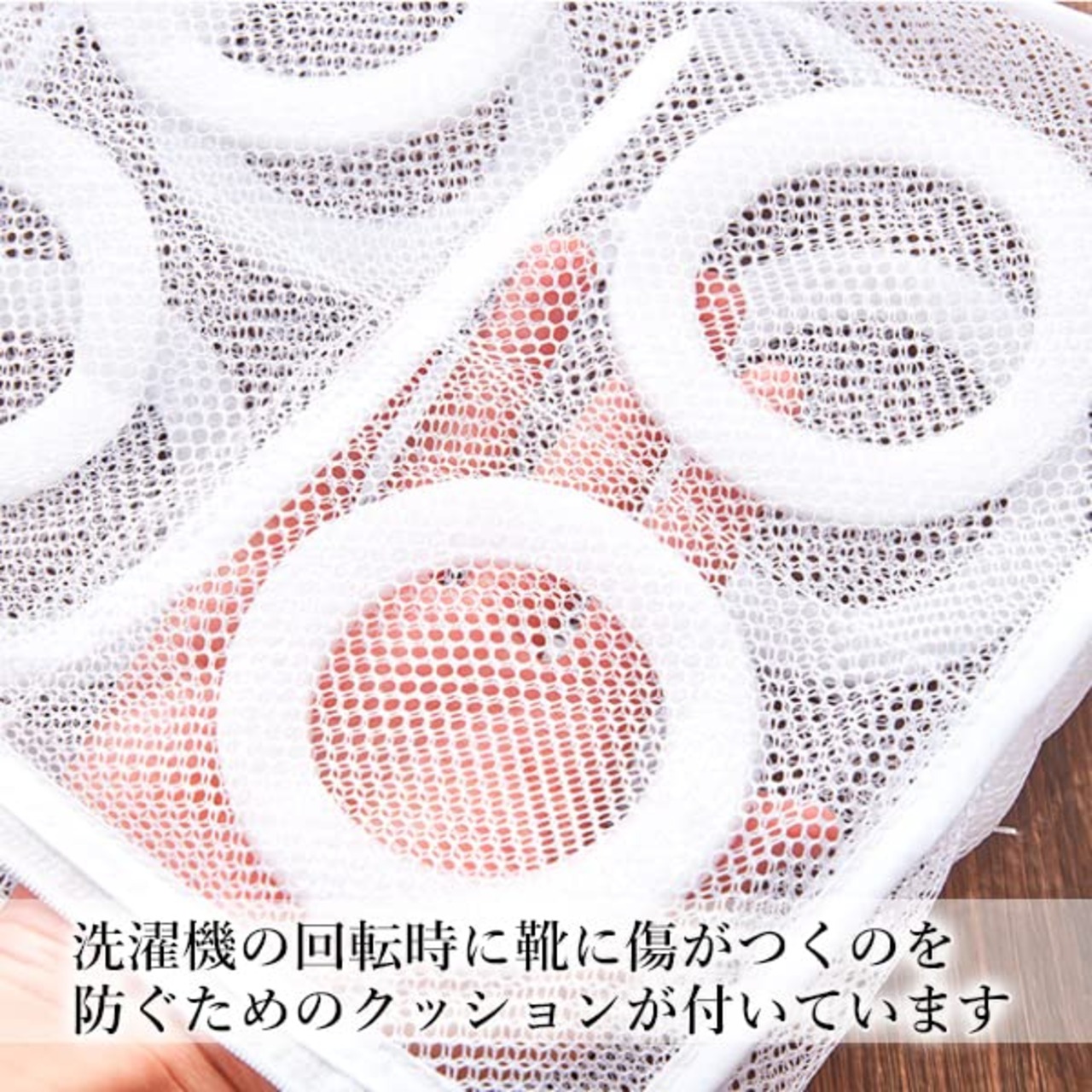 ・洗濯機で洗い終わった後にそのまま干せる靴用洗濯ネットです。 ・クッション付きで洗濯機の回転時に傷がつくのを防ぎます。 ・ネットの真ん中に仕切りがあるので靴同士が擦れるのを防ぎます。 ・ファスナーが大きく開くのでシューズの出し入れがしやすくなっています。