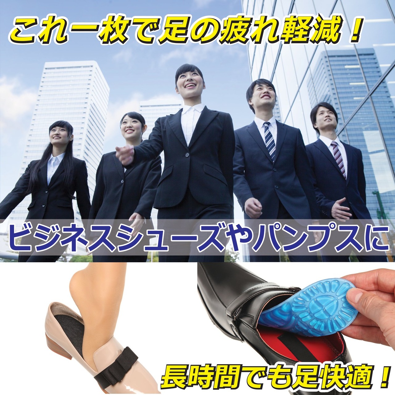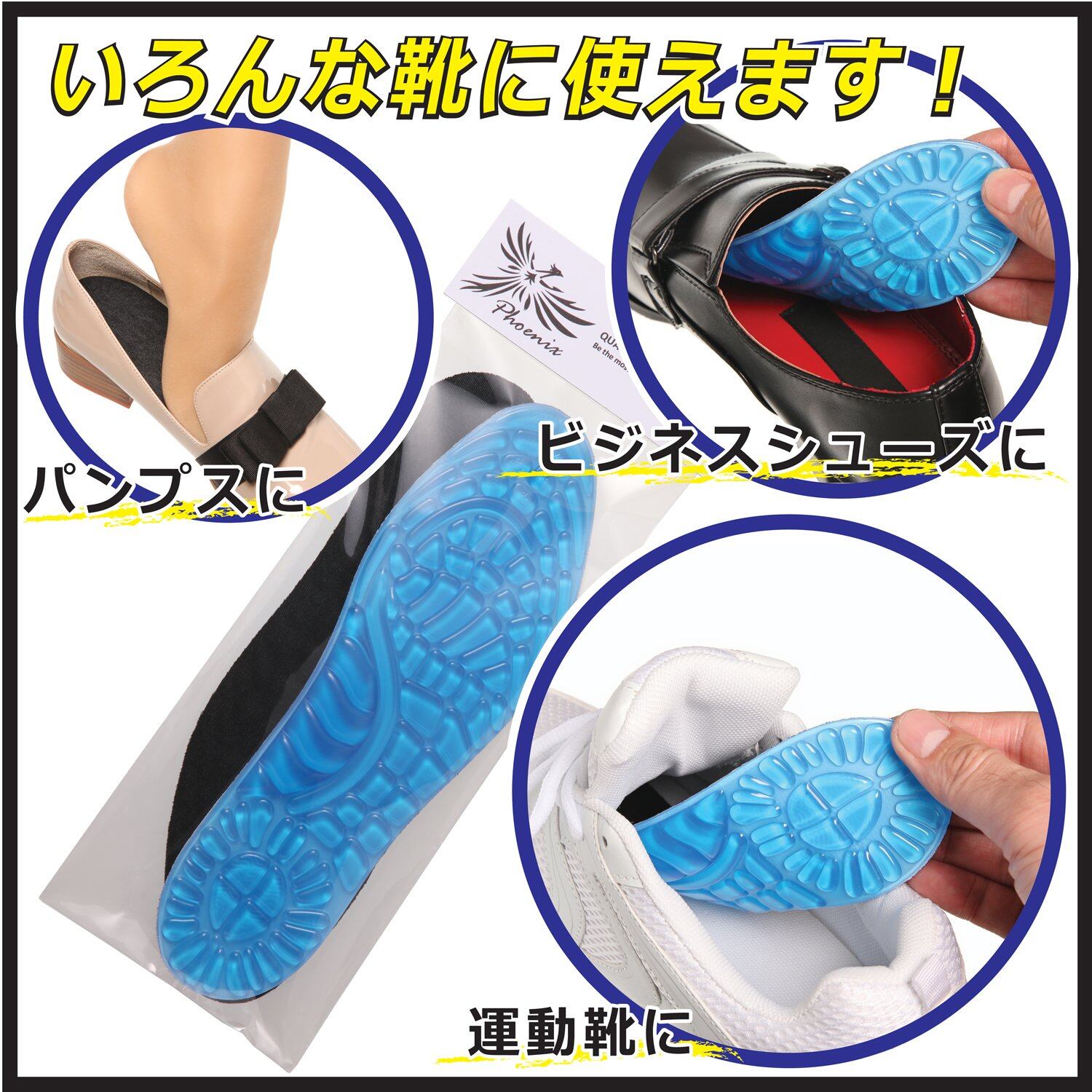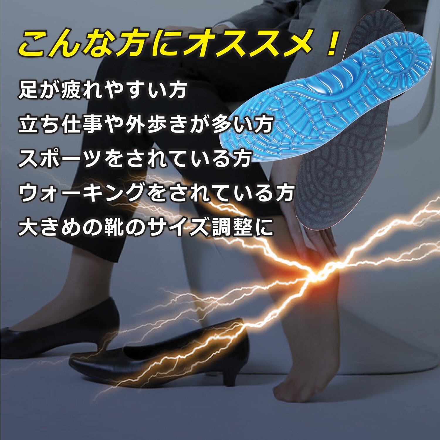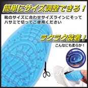 これ1枚で足の疲れ軽減!いろんな靴に使えます。ビジネスシューズやパンプス、運動靴に!長時間でも足快適衝撃吸収、痛み軽減!着地からの衝撃を抑えて、かかとや足裏、膝関節や腰などへのダメージを抑える効果が期待。サイズ調整自由自在で安心。滑り止め機能、汗を吸収、細菌抑制の高い機能。