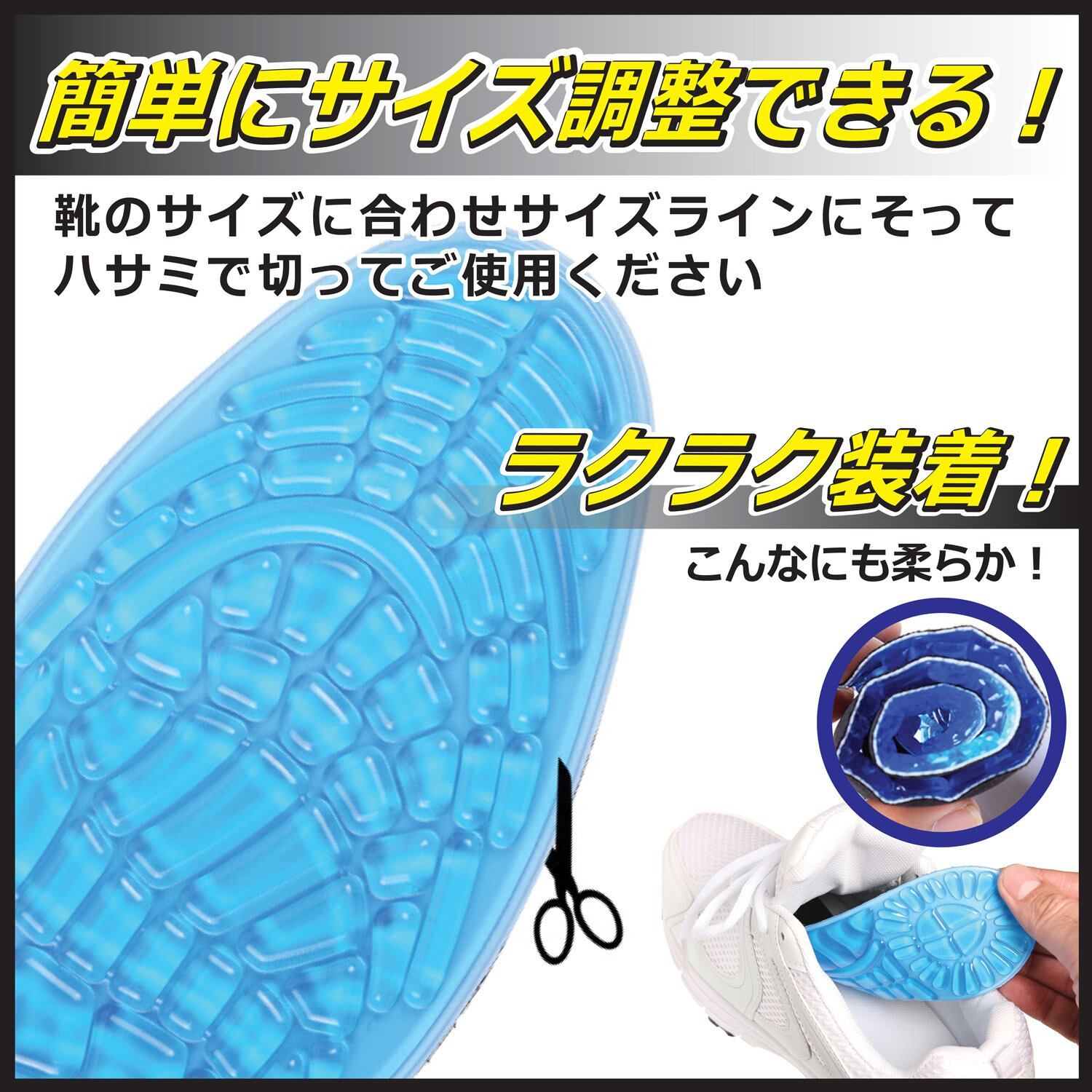 簡単にサイズ調整できる!靴のサイズに合わせサイズラインにそってハサミで切ってご使用ください。ラクラク装着!こんなにも柔らか。