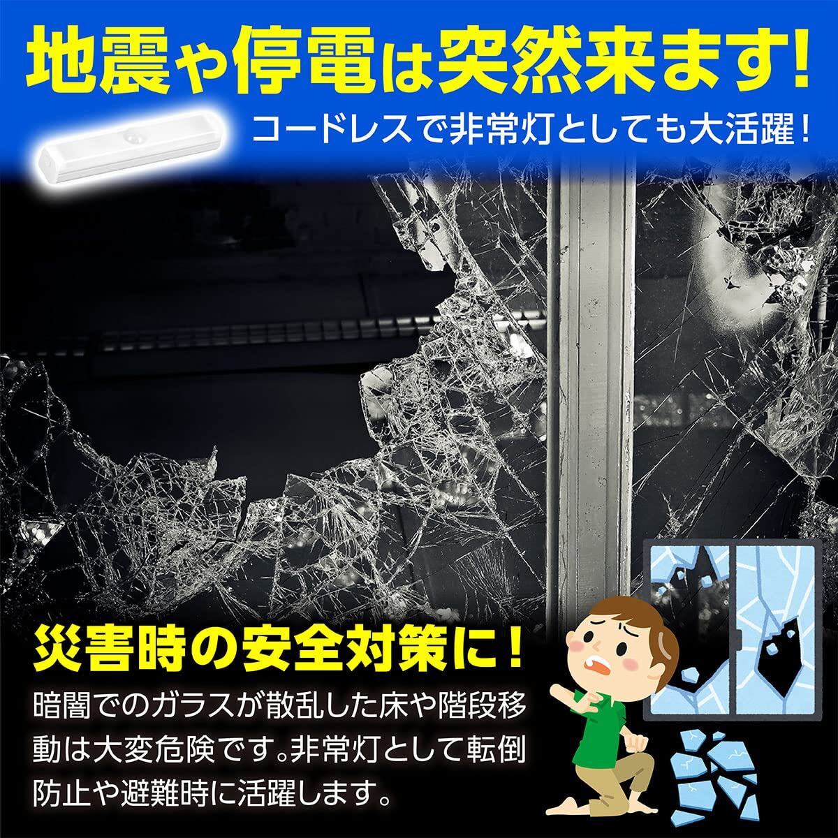 人感センサー付きのLEDライト2個セットです。 夜の暗い玄関・廊下・クローゼットの暗い場所で自動点灯します。 帰宅時や夜にスイッチまでが暗くて困っている、を解決します。 USB充電式のコードレスで設置場所も選びません。 大切なお子様やおじいちゃん、おばあちゃんの転倒防止、 地震対策や停電対策、屋内の防犯対策にも活躍します。 ガラスが飛び散った真っ暗な廊下の避難は危険ですよね。 常時点灯モードにも切り替え可能なため懐中電灯としても使用できます。
