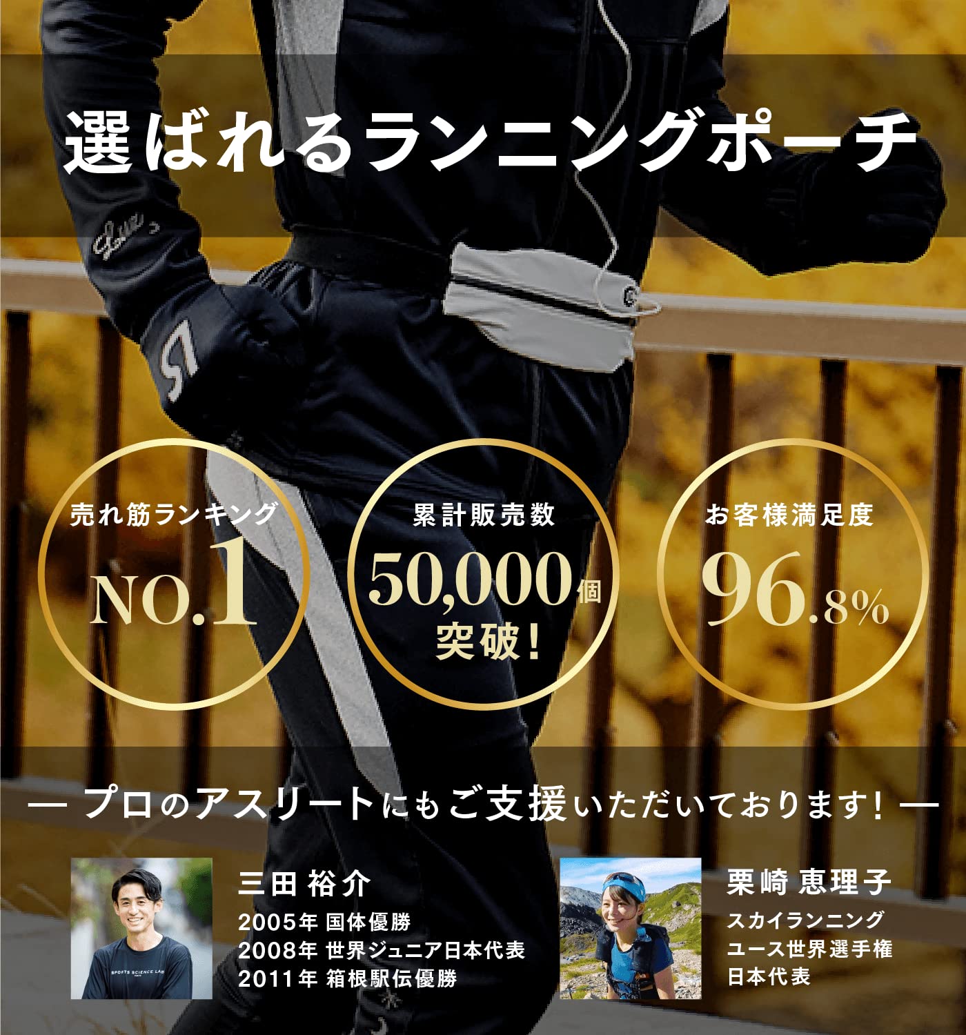 【 プロのアスリートも認めるランニングポーチ 】プロのアスリートの方々にもご愛用いただいている高品質なランニングポーチです。シンプルなデザインなので、どんな服装にも合わせやすく、肌に直接つけても痛くないので洋服の中につけていただき隠すことも可能です。