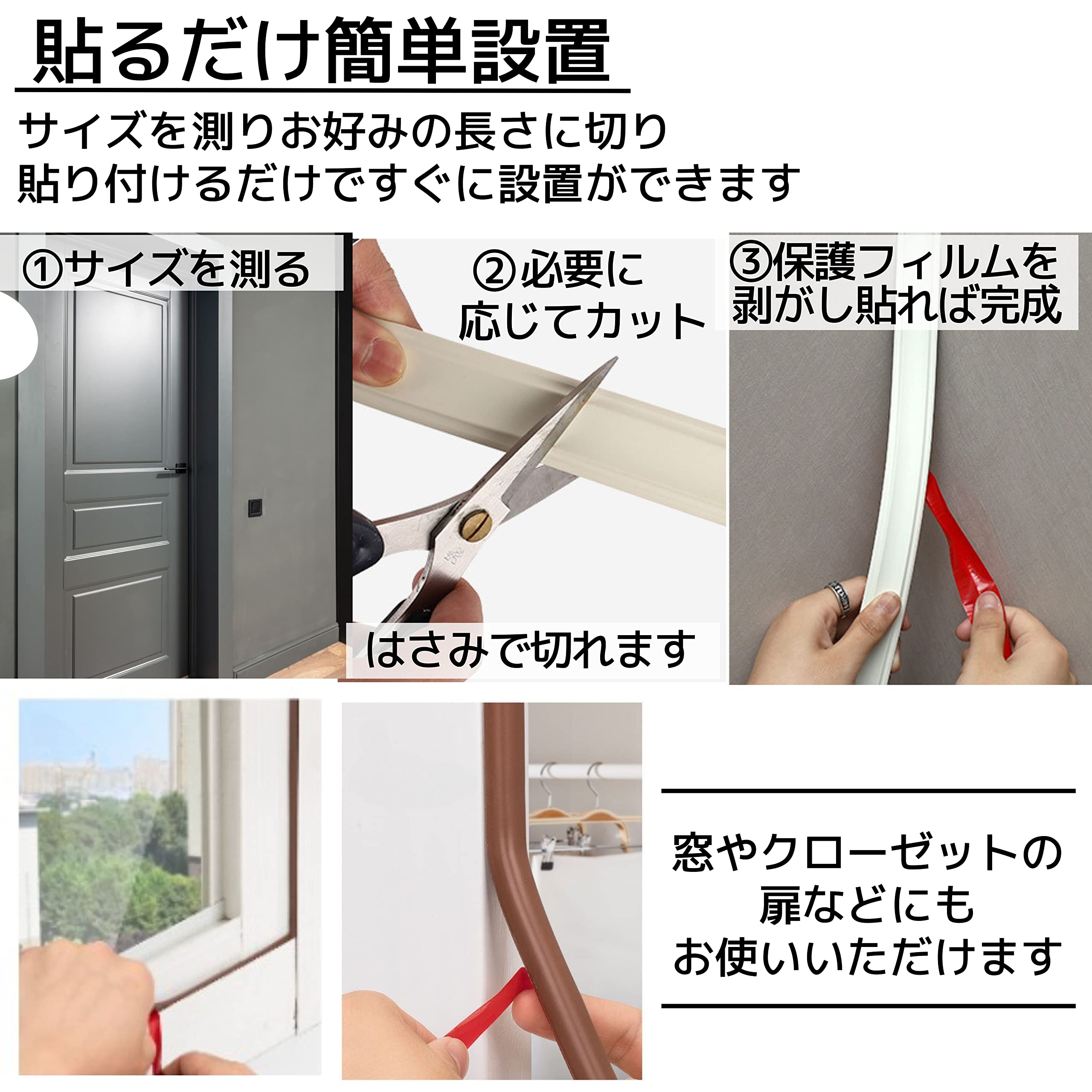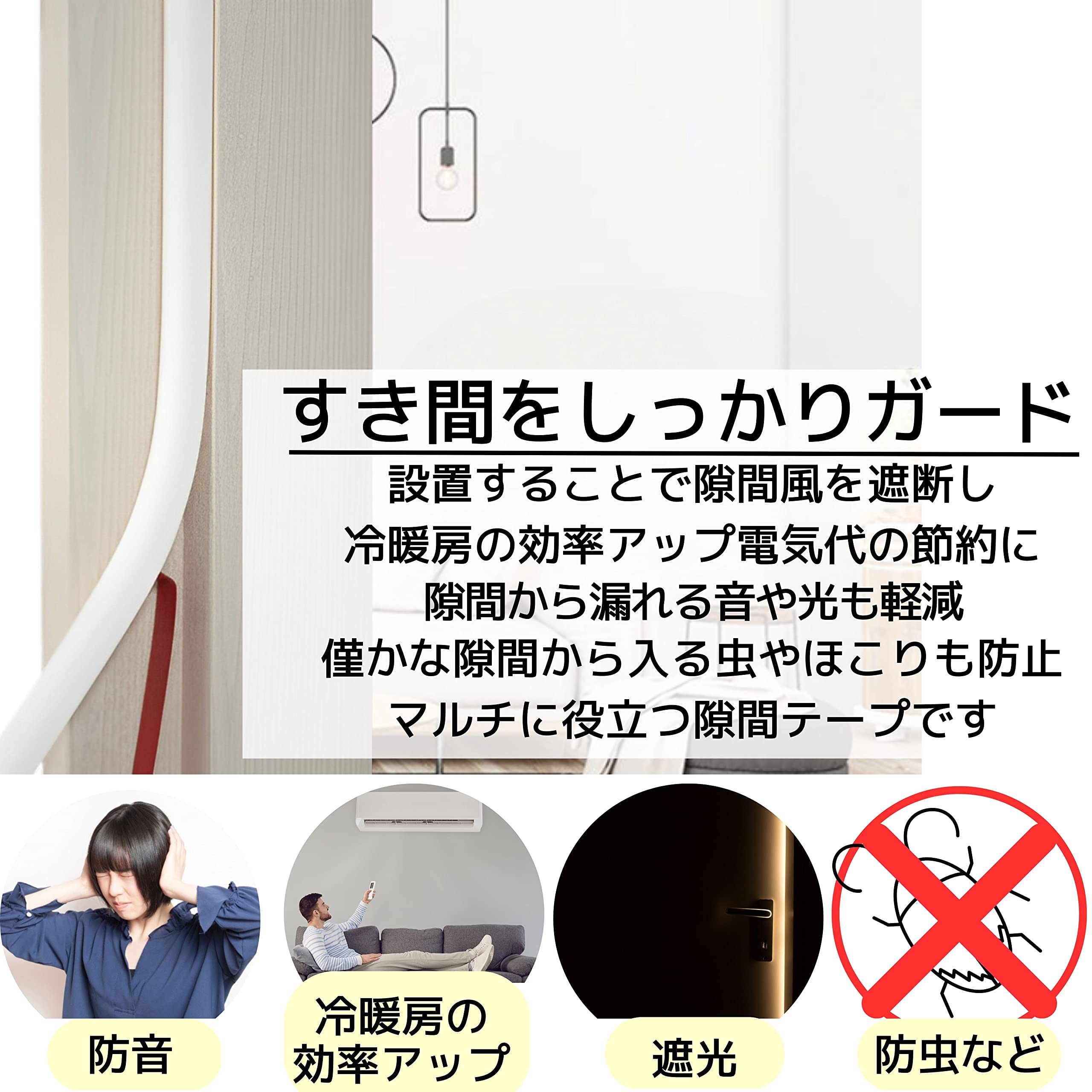 【すき間をしっかりガード】設置することで隙間風を遮断し冷暖房の効率アップ電気代の節約に。隙間から漏れる音や光も軽減。僅かな隙間から入る虫やほこりも防止。隙間風、防音、遮光、防虫、ほこり防止にとマルチに役立つ隙間テープです。ドアや窓、サッシなどにお使いいただけます。