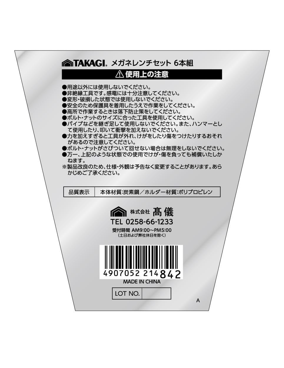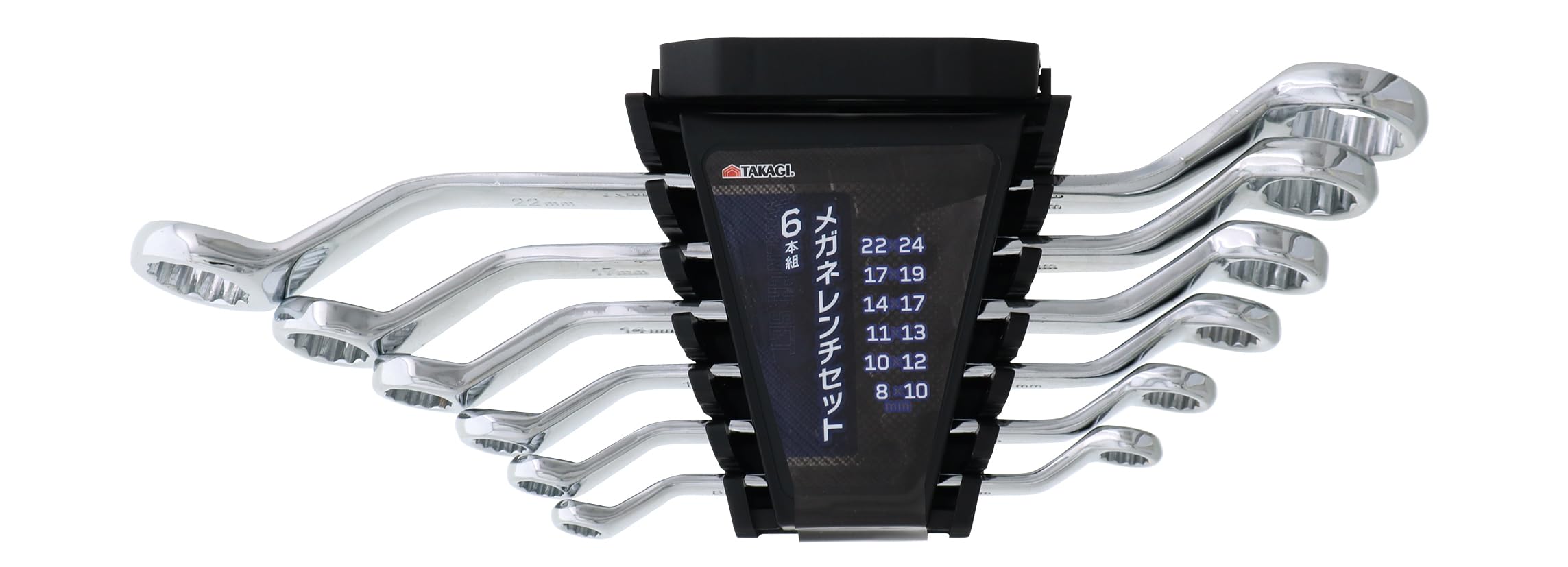 高儀(Takagi) メガネレンチセット ミリ 6本組 8×10mm/10×12mm/11×13mm/14×17mm/17×19mm/22×24mm ボルト ナット 締めつけ ゆるめ作業 メガネレンチ 工具 収納に便利 ホルダー付き