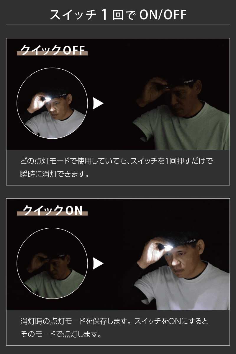 【クイックON搭載】消灯時の点灯モードを保存しており、スイッチをONにすると、そのモードで点灯します。