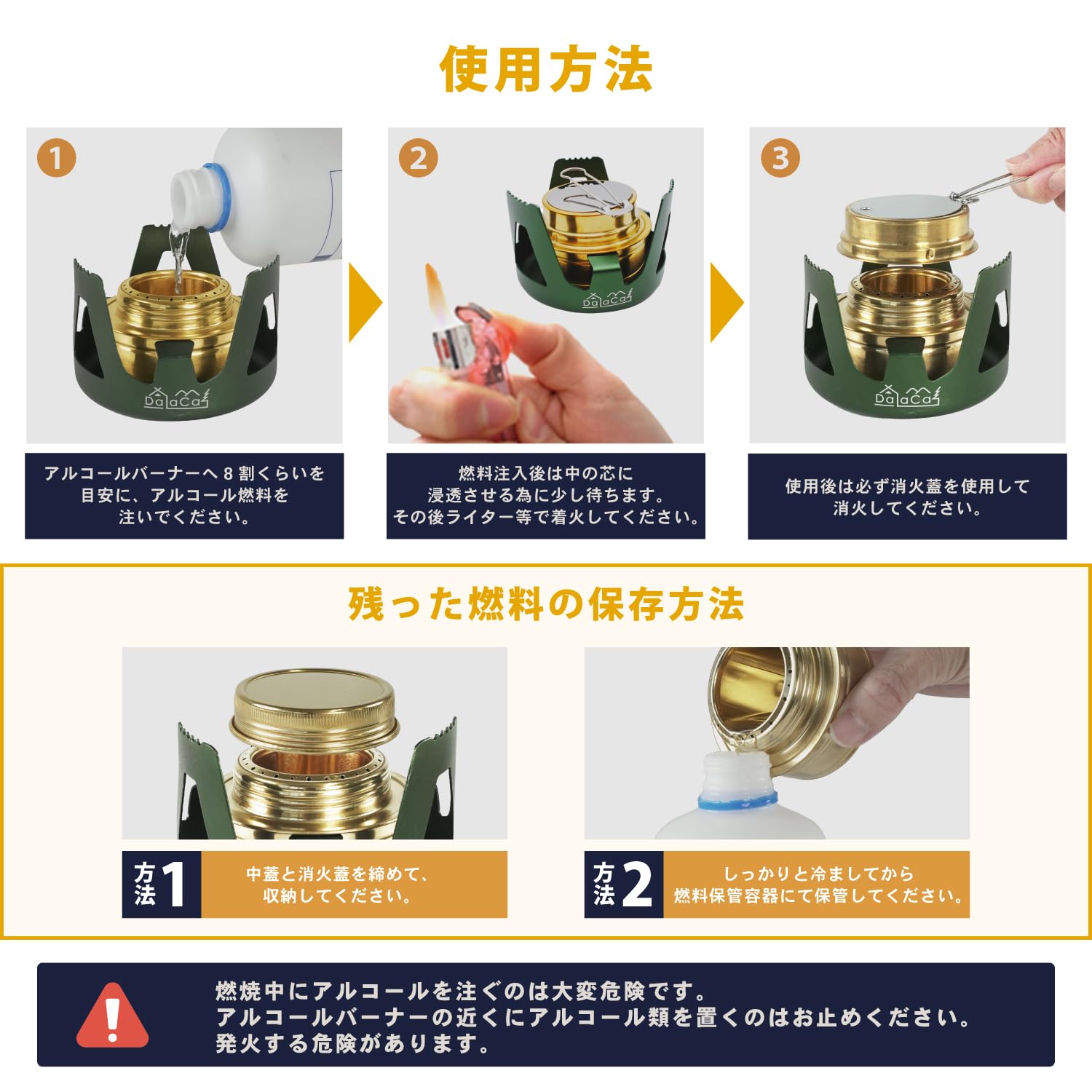 <使用方法>アルコールストーブを五徳の中へ入れ、燃料用アルコールを注ぎライターなどで着火するだけで直ぐに料理などに使用する事が出来ます。