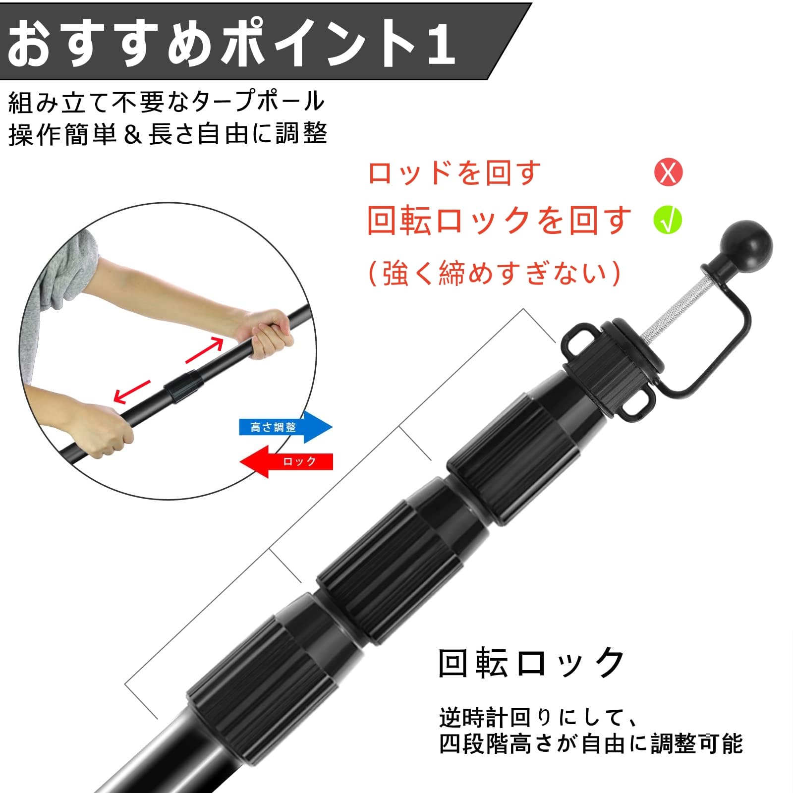 【4段階伸縮&長さ自由に調整】タープポールは使用のシーンに合わせて、86cm~250cmまでの広範囲で、長さを微調節することができです。ポールをひねって回転するだけで伸縮させ、好みの長さが自由に変更可能です。