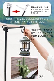 【収納式ダブルハンガー】トップのランタンフックはポール内に収納されるのでかさばらず、使用時には引き出すだけのお手軽さながら、がっちりとランタンを受け止める。2箇所にフックがあるので、ランタン2つやその他使い道があります。