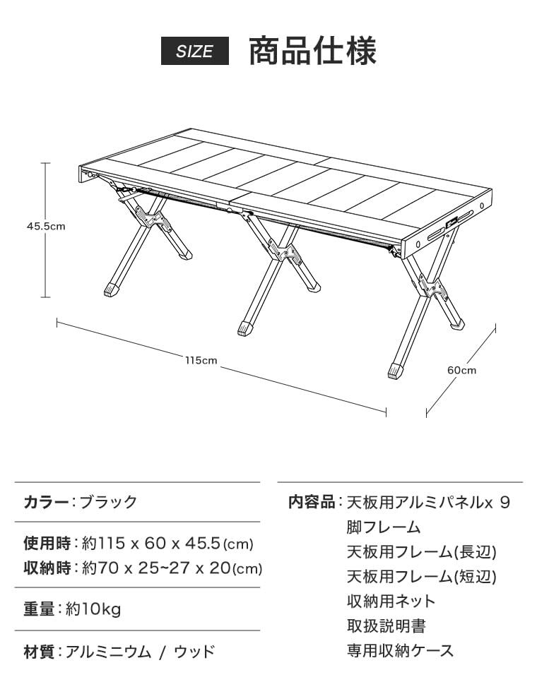 【商品仕様】「カラー」ブラック「サイズ」使用時:約115 x 60 x 45.5cm収納時:約70 x 25 x 20cm「重量」約10kg「材質」アルミニウム/ウッド「内容品」テーブル本体 / 収納ネット / 収納袋 / 日本語説明書