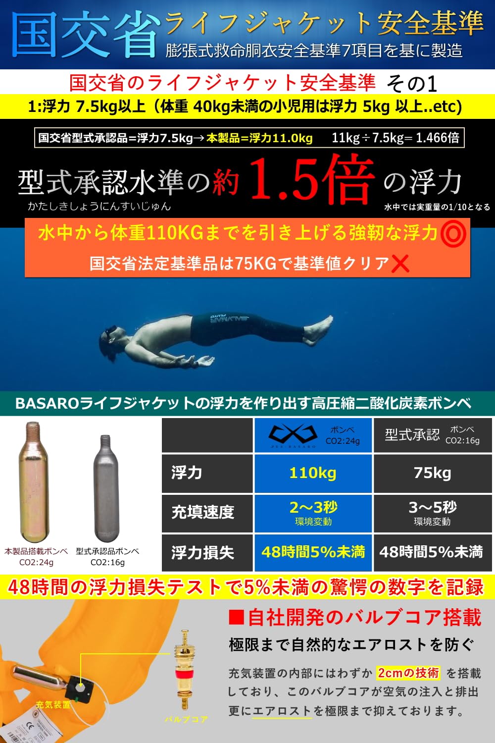 自動膨張式は初心者の方には特にお勧めで海中転落時にパニックなってもライフジャケットが水圧を検知し2〜3秒でMAX値までフロートが膨れます。このBASARO製ライフジャケット2ndラインを搭載しており、海中転落時に万が一自動膨張しない場合に備えて手動でも起動できる様にしております。これはパラシュートのパートナーラインと同じ考えです。