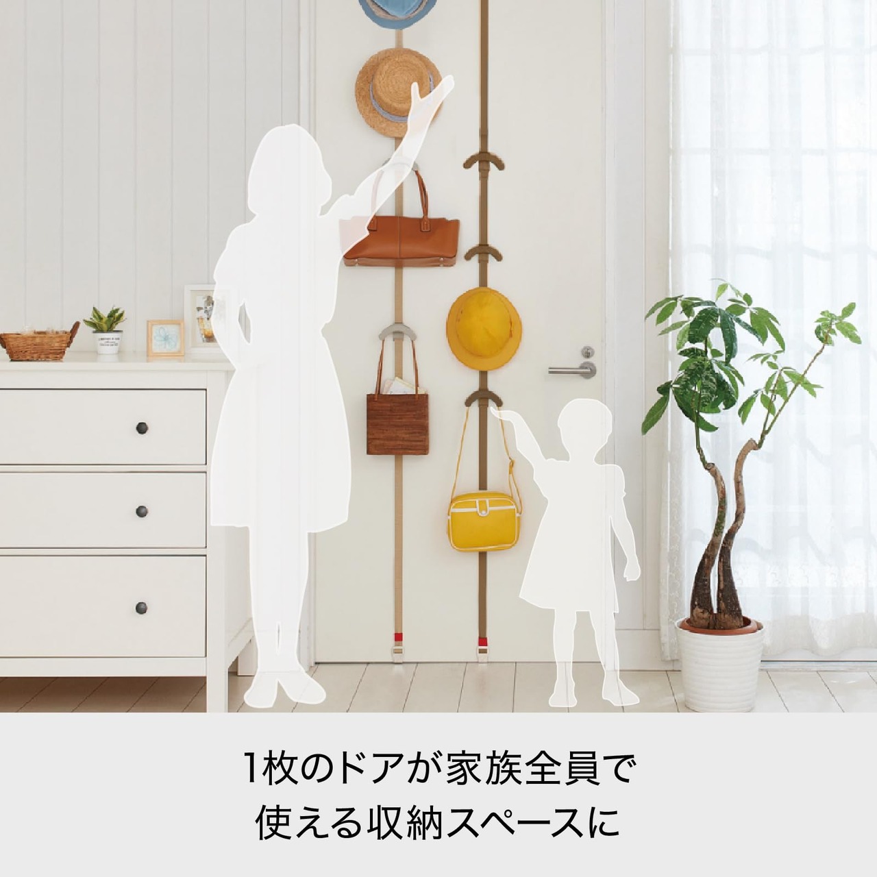 おうちのドアが収納スペースになる、ドアフックです。フックはスライド自在だから、お好みの高さにセット可能。