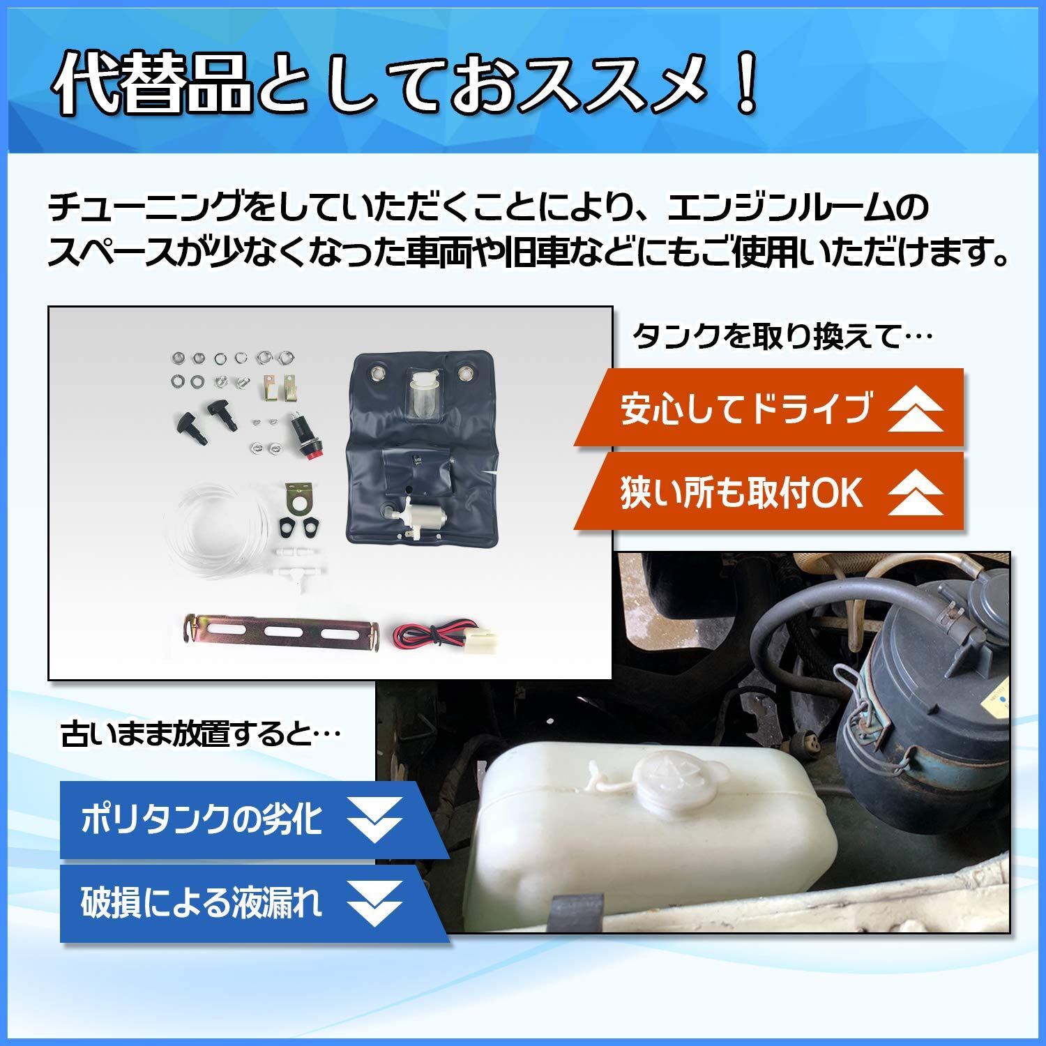 本製品は12V車両向けに設計されており、タンク本体に加えてウォッシャーノズル、ホース、取付用ステー、スイッチ、ボルトナットがセットになっています。さまざまな取り付けニーズに対応でき、汎用ウォッシャータンクとしてウォッシャーモーターと組み合わせての使用も可能です。洗浄機能の追加や強化を考えている方におすすめです。