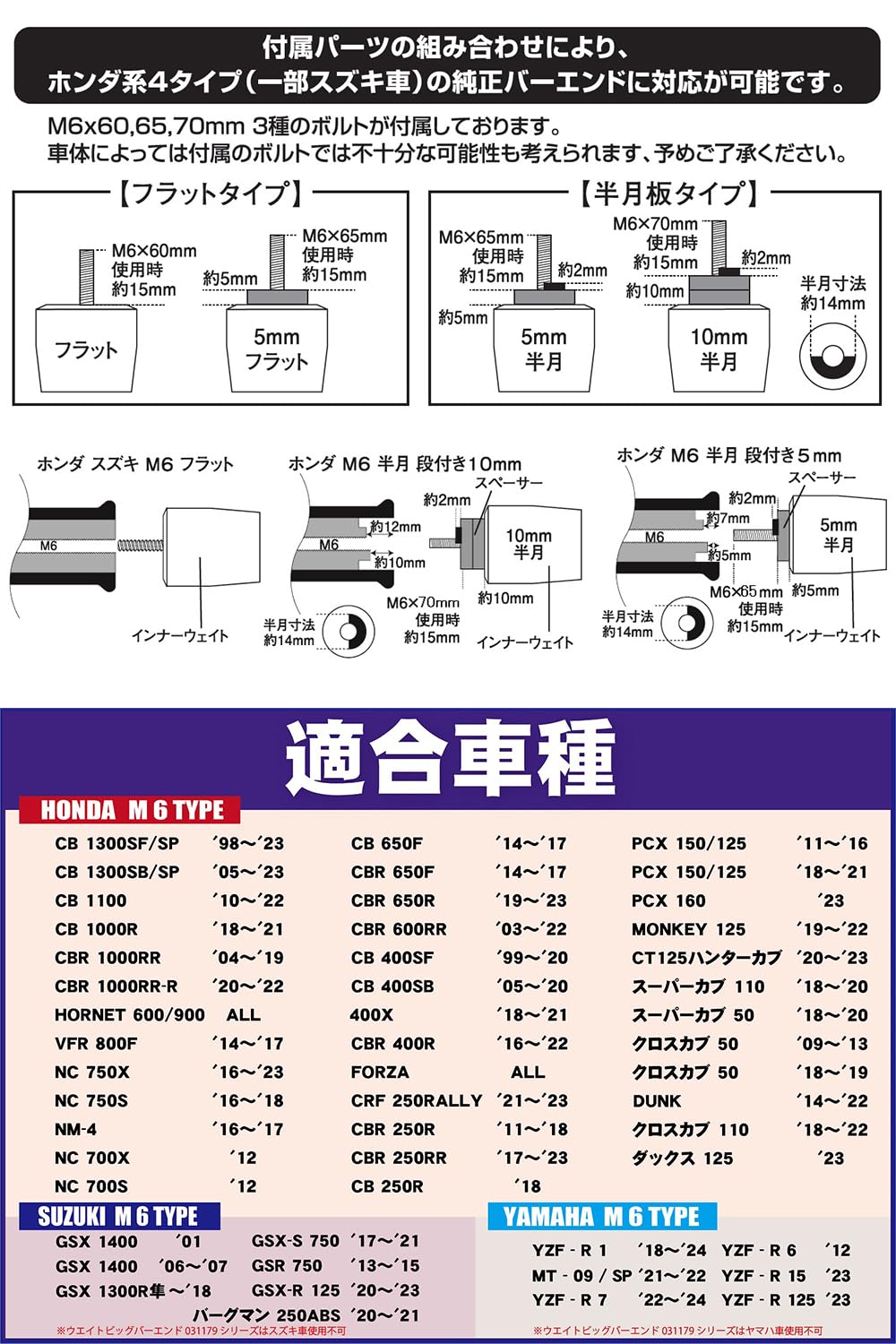 付属パーツの組み合わせにより、ホンダ、スズキ車の純正バーエンドに対応が可能です。