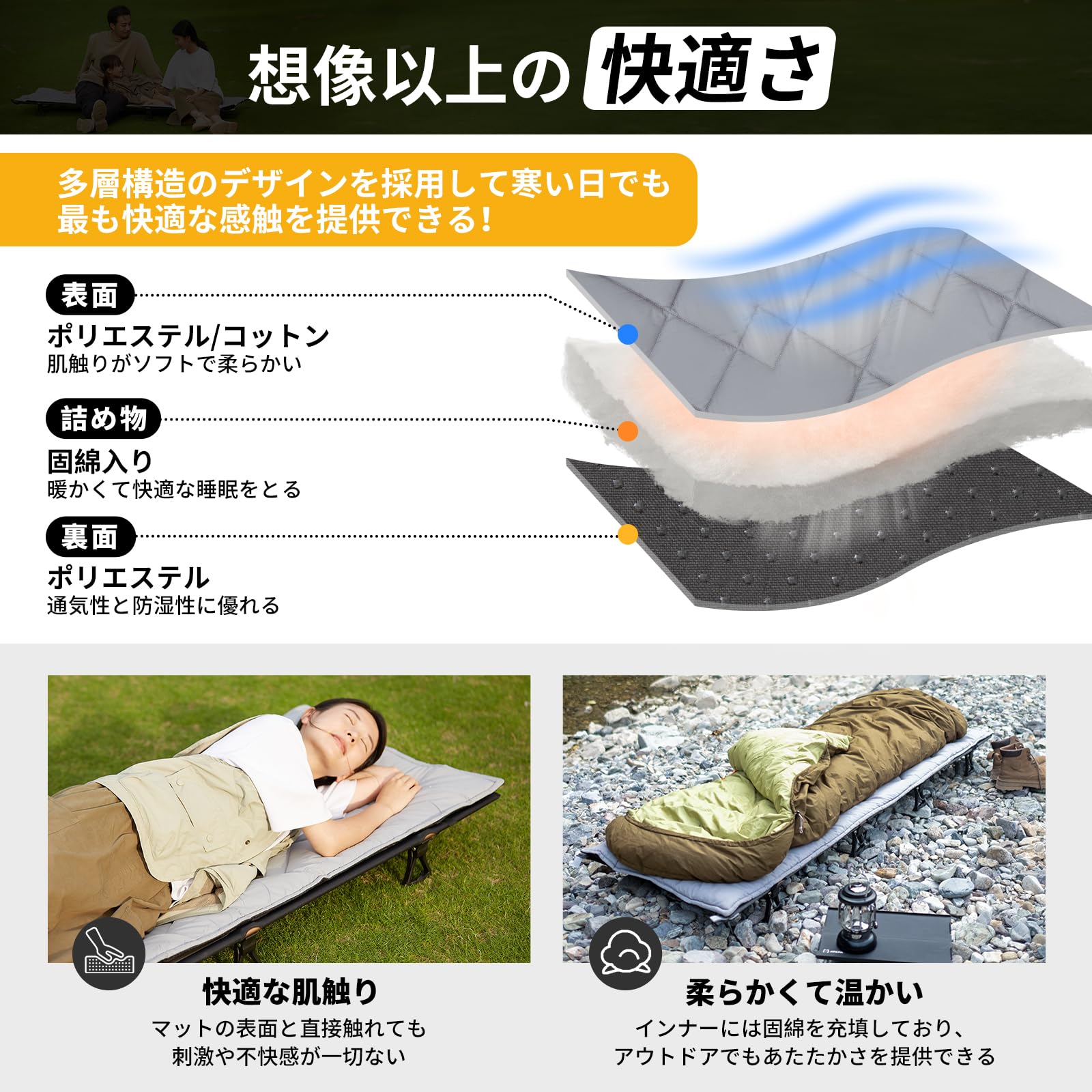 【肌に優しい素材】表面にポリエステル/コットンを使用し、柔らかく快適な肌触りです。内側には500g/㎡の綿が入っており、アウトドアでも暖かく快適な睡眠ができます。