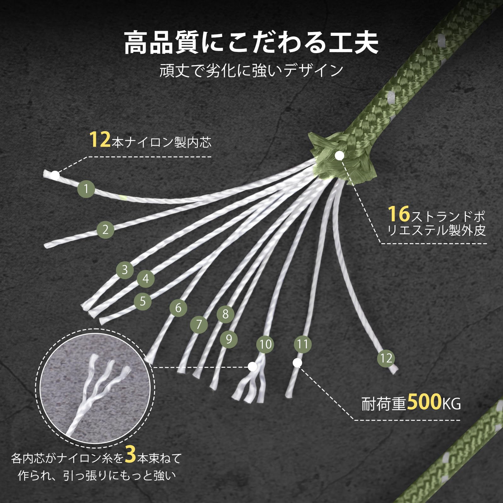 【耐荷重500KG】DANOFYテント用パラコードはナイロン製内芯とポリエステル製外皮からなり、各内芯がナイロン糸を3本撚り合わせて合計12芯で作られた張りに強いガイロープです。アウターが16ストランドで緻密に編まれておるこのガイロープ 5mmは柔らかくて軽量でありながら、耐摩耗性と耐荷重性が大幅に向上しています。この頑丈な構造のおかげで、弊社のテントロープは最大500kg(1100ポンド)の耐荷重に至って、ほとんどの使用中での破断がご心配なくなります。