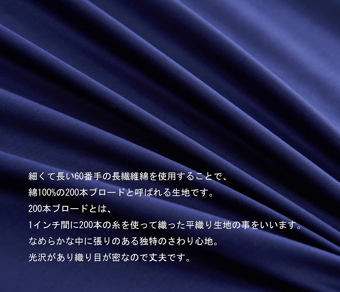 1インチ間に200本の糸を使って織った平織りボックスシーツです。ホコリや毛羽立ちが出にくく、汗でもベタつかないサラサラ感を保ちます。吸温性、、摩擦、水洗いに強い人気商品です。