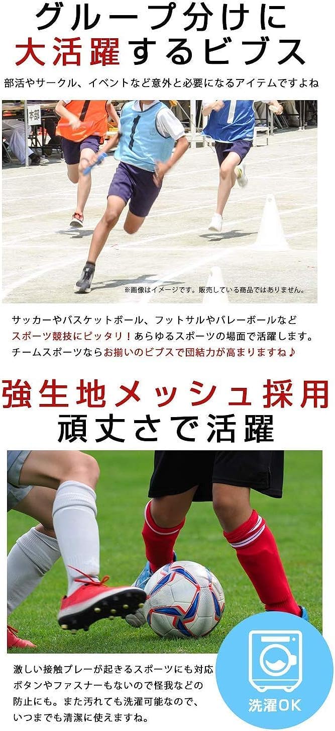 【視認性が良いカラー展開】レッド、ブルー、イエロー、オレンジ、ブラック、イエローグリーン、グリーン、ピンク、ネイビー、パープルの10色展開 です。(※イエローグリーンはイエローに近いカラーとなります為、イエローと併せてのご使用はおすすめ出来ません。 )遠くから見ても視認性も良いです。 【収納バッグ付き】 移動する際に便利なビブス収納バッグ付きです。しっかりと閉まりますので汗など臭いが漏れにくいです。