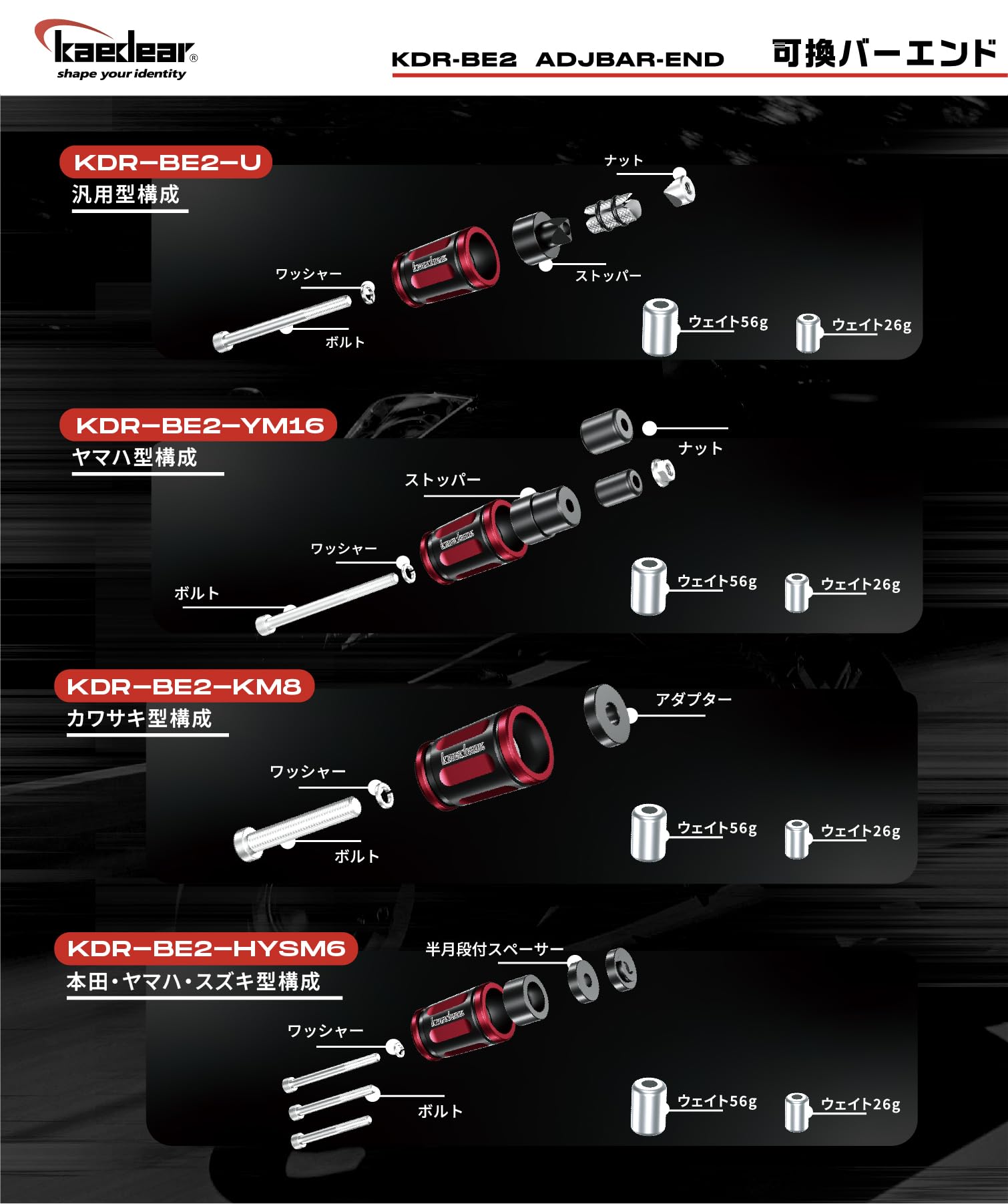 【汎用】 ■重量:84g ■追加ウェイト:26g/56g ■内径:12.7~25.4mm 【ホンダ/ヤマハ/スズキ】 ■重量:53g/58g/64g ■追加ウェイト:26g/56g ■ボルト径:M6 ■ボルト長さ:55mm(15mm)/60mm(20mm)/70mm(30mm) ■スペーサー:厚さ5mm×2枚 【ヤマハM16】 ■重量:86g ■追加ウェイト:26g/56g ■内径:13.5-17mm 【カワサキM8】 ■重量:59g ■追加ウェイト:26g/56g ■ボルト径:M8 ■ボルト長さ:50mm(11mm)