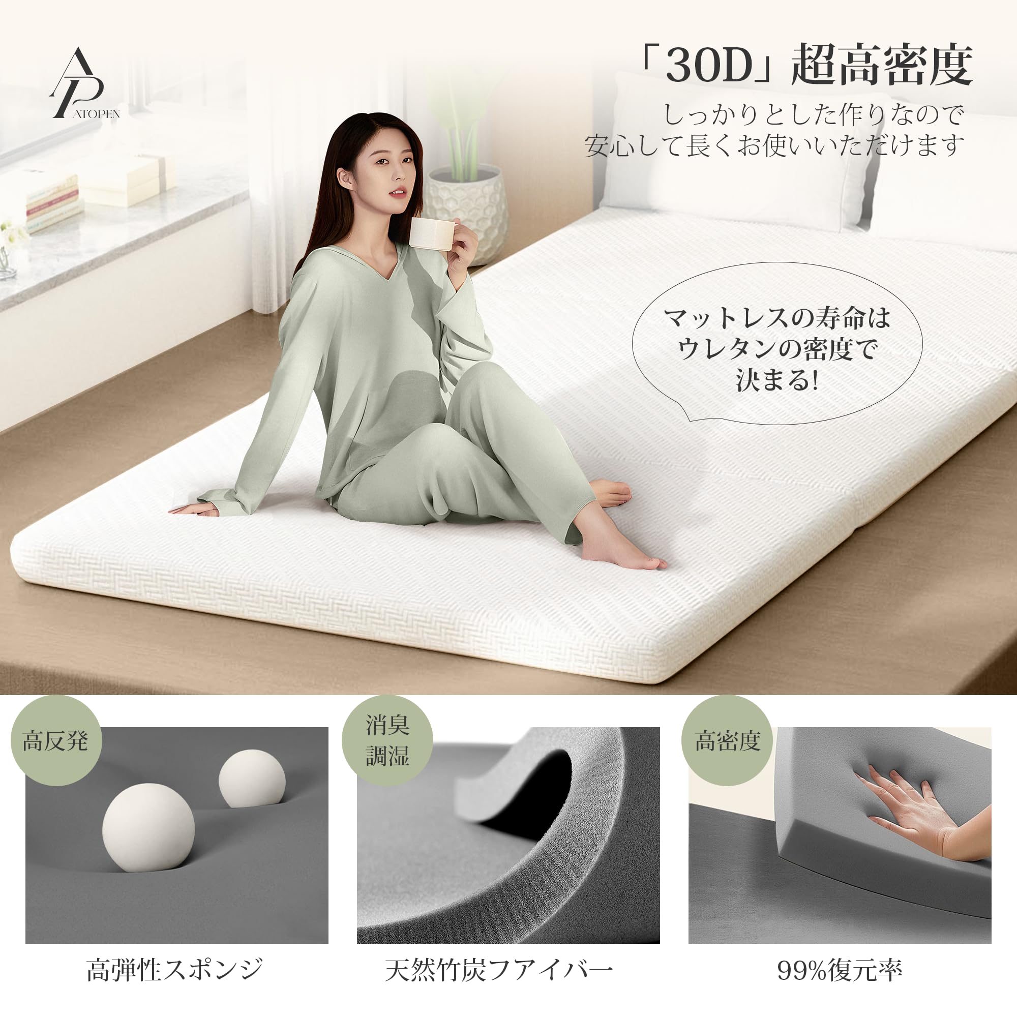 【高反発のサポート力】30D高反発ウレタンフォームで弾力性や復元力に優れ、180Nで力なサポートを提供し、脊椎のアライメントを保ち、背中や首の圧力を軽減し、体がベッドに過度に沈み込むことを減少させ、適切な姿勢と睡眠姿勢を維持します。耐久性がよくて様々な寝姿勢に適しています。