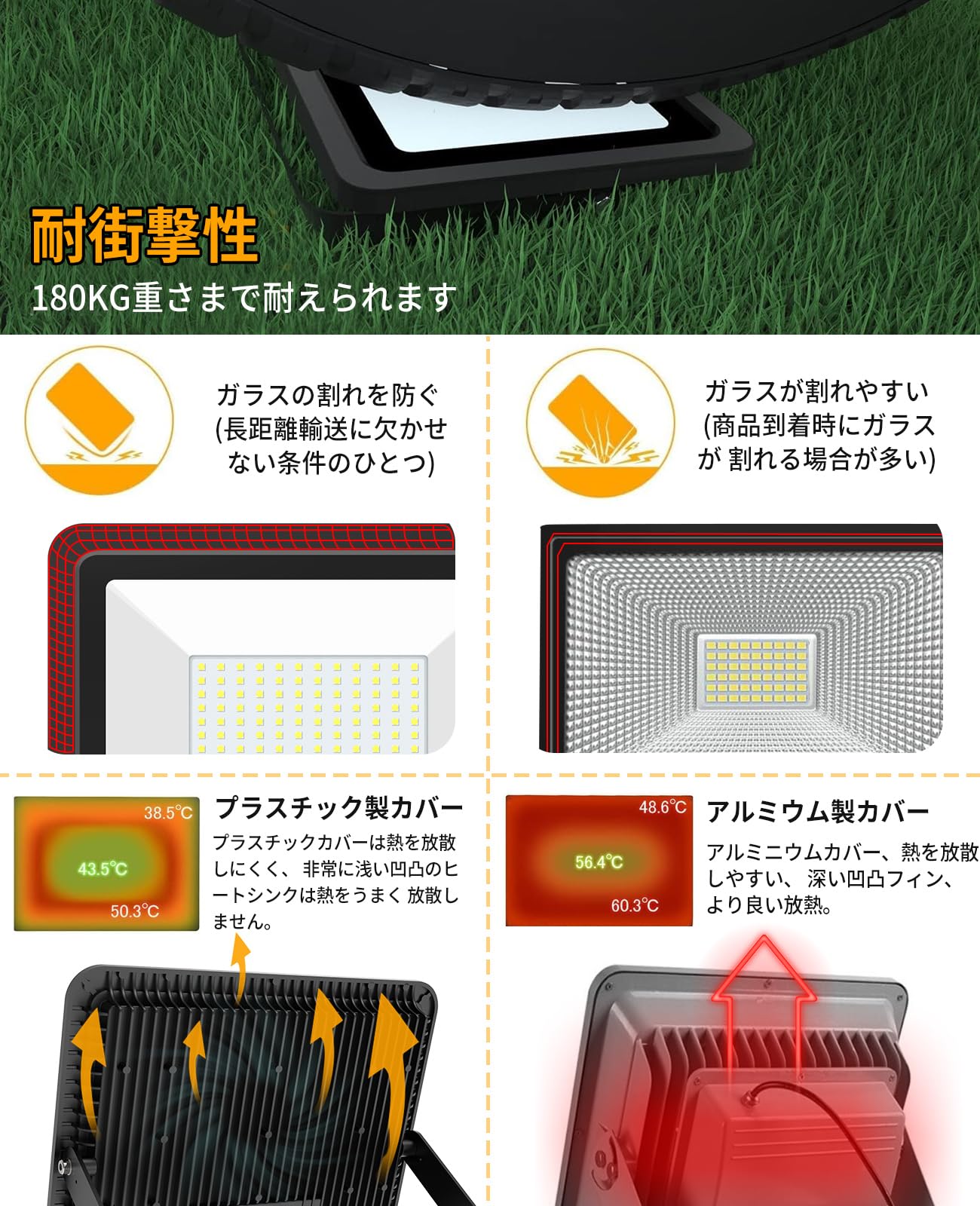 【2023超薄型・超高輝度な投光器】: チップ:SMD チップを採用、広角照射:120°、光束:13000ルーメン(1300w相当) 、色温度6500K(昼光色) 、接続線:1.8メートル°、電圧:100-110V 、重さ:0.8kg 、防塵防水:IP66、 放熱設計:6063型アルミ材質と櫛形ヒートシンク 、定格周波数:50/60Hz、寿命:約8万時間