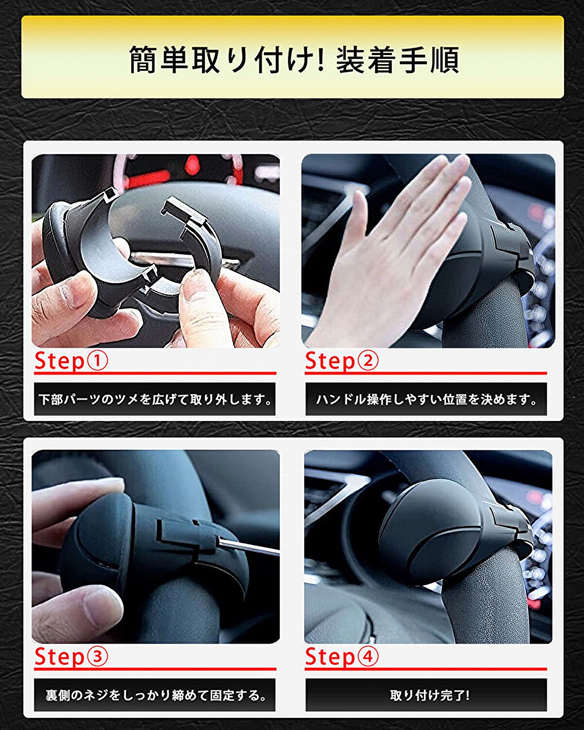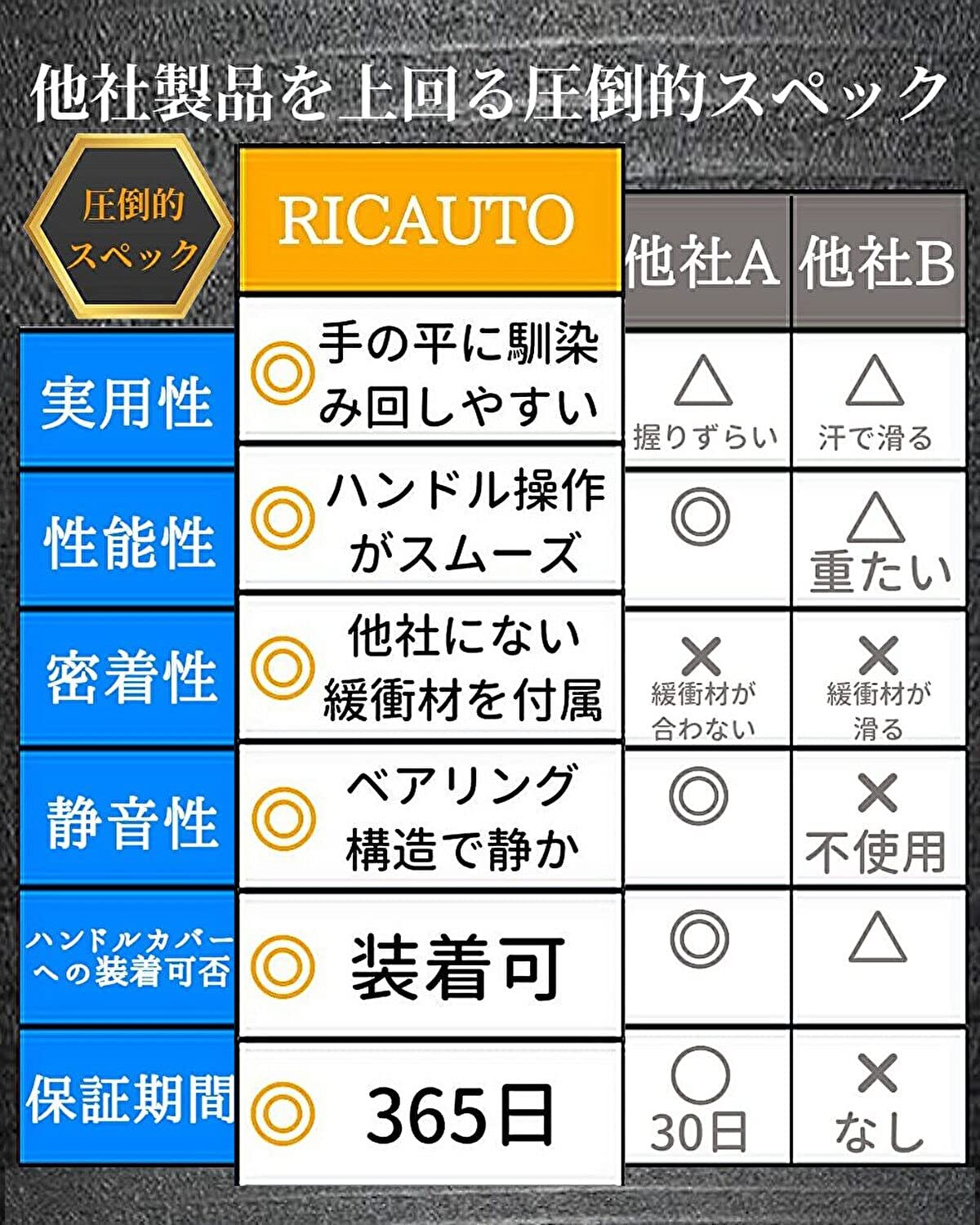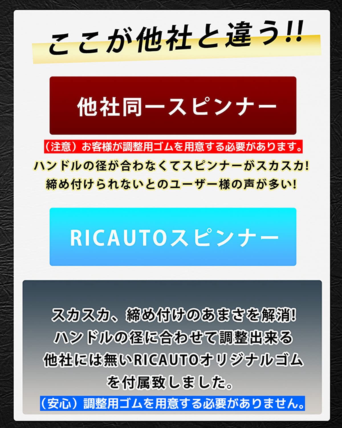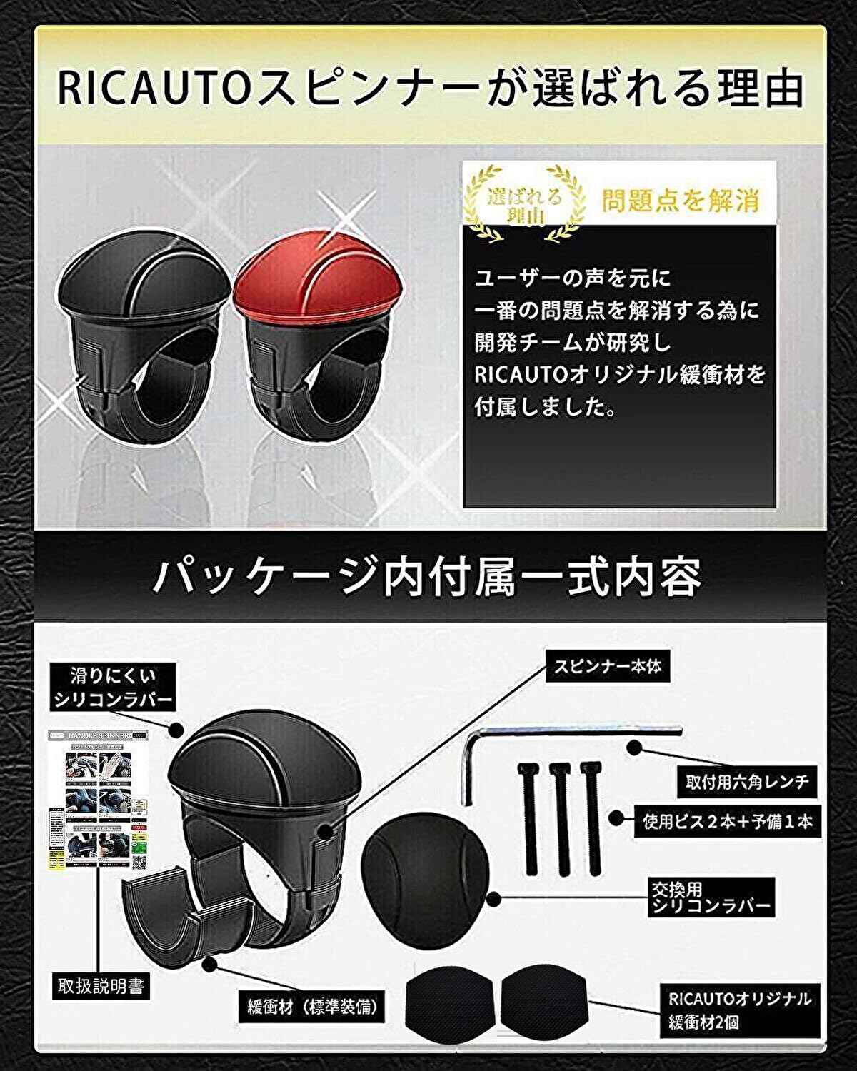 【RICAUTOが選ばれる理由】ユーザー様の寄せられた声を元に、回転を軽くする為に静音ベアリング構造仕様。ハンドルへの傷や操作時の金属音を防ぐため、防傷緩衝材を付属。また、緩衝材を調整することでハンドルカバー(極太NG)付きの車にも取り付け可能になりました。 また、ハンドルとの密着性を良くして欲しいとの声を頂き、RICAUTOオリジナルゴムで設計し、より多くの方にRICAUTO ハンドルスピンナー をご体感頂けるようにしました。